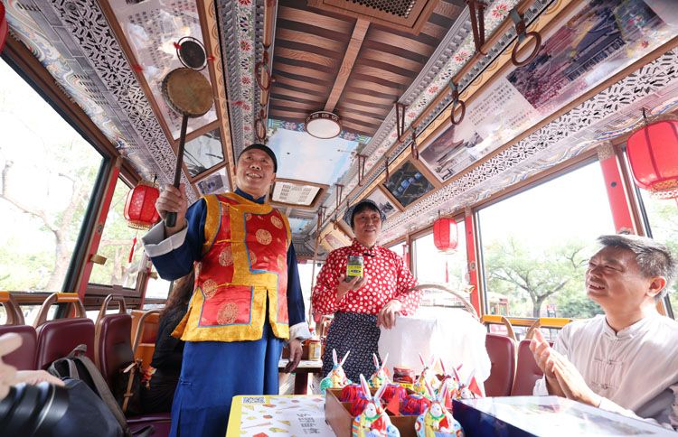 “大美中轴”观光巴士上,家住前门的老街坊张忠强向乘客介绍北京传统文化。