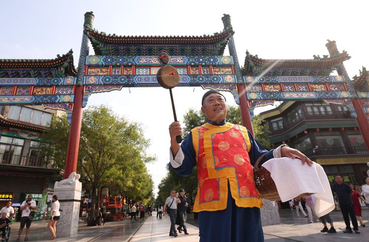 9月19日,“聊吆喝,话老字号”主题活动在“大美中轴”观光巴士上拉开序幕。“臭豆腐,酱豆腐,王致和的臭豆腐,臭豆腐饶香油,酱豆腐蘸窝……”“京城叫卖大王”臧泉江一阵阵洪亮的叫卖声在前门正阳桥牌楼响起,吸引了众多中外游客纷纷拍摄。