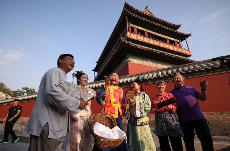 9月19日,前门大街,“京城叫卖大王”臧泉江表演的叫卖声字正腔圆,有韵有辙。