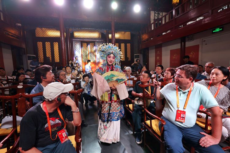 9月19日,2024北京文化论坛开幕。当天下午,来自中国、马来西亚、肯尼亚等多个国家的专家学者一同观摩了天坛、前门会馆群落等古建筑,开启了一场文化探索之旅。图为专家学者在东城区颜料会馆欣赏京剧表演。