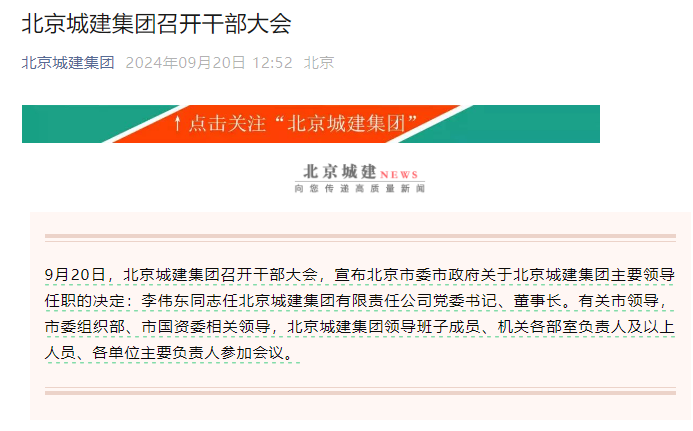 新京报讯 据北京城建集团官微消息,9月20日,北京城建集团召开干部大会,宣布北京市委市政府关于北京城建集团主要领导任职的决定:李伟东同志任北京城建集团有限责任公司党委书记、董事长。有关市领导,市委组织部、市国资委相关领导,北京城建集团领导班子成员、机关各部室负责人及以上人员、各单位主要负责人参加会议。