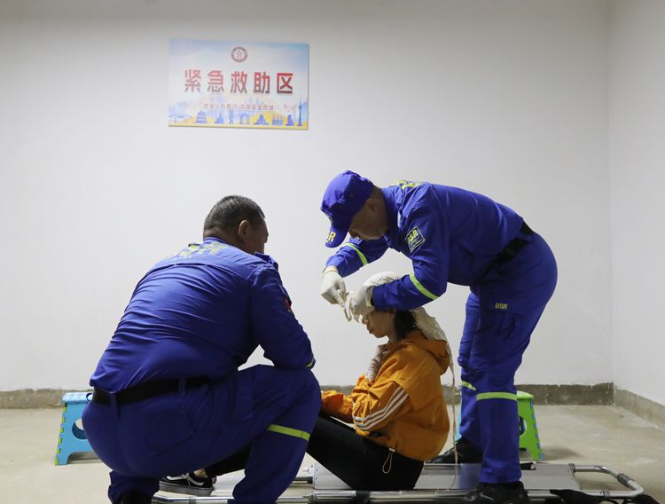 蓝天救援队队员演示为伤者包扎。