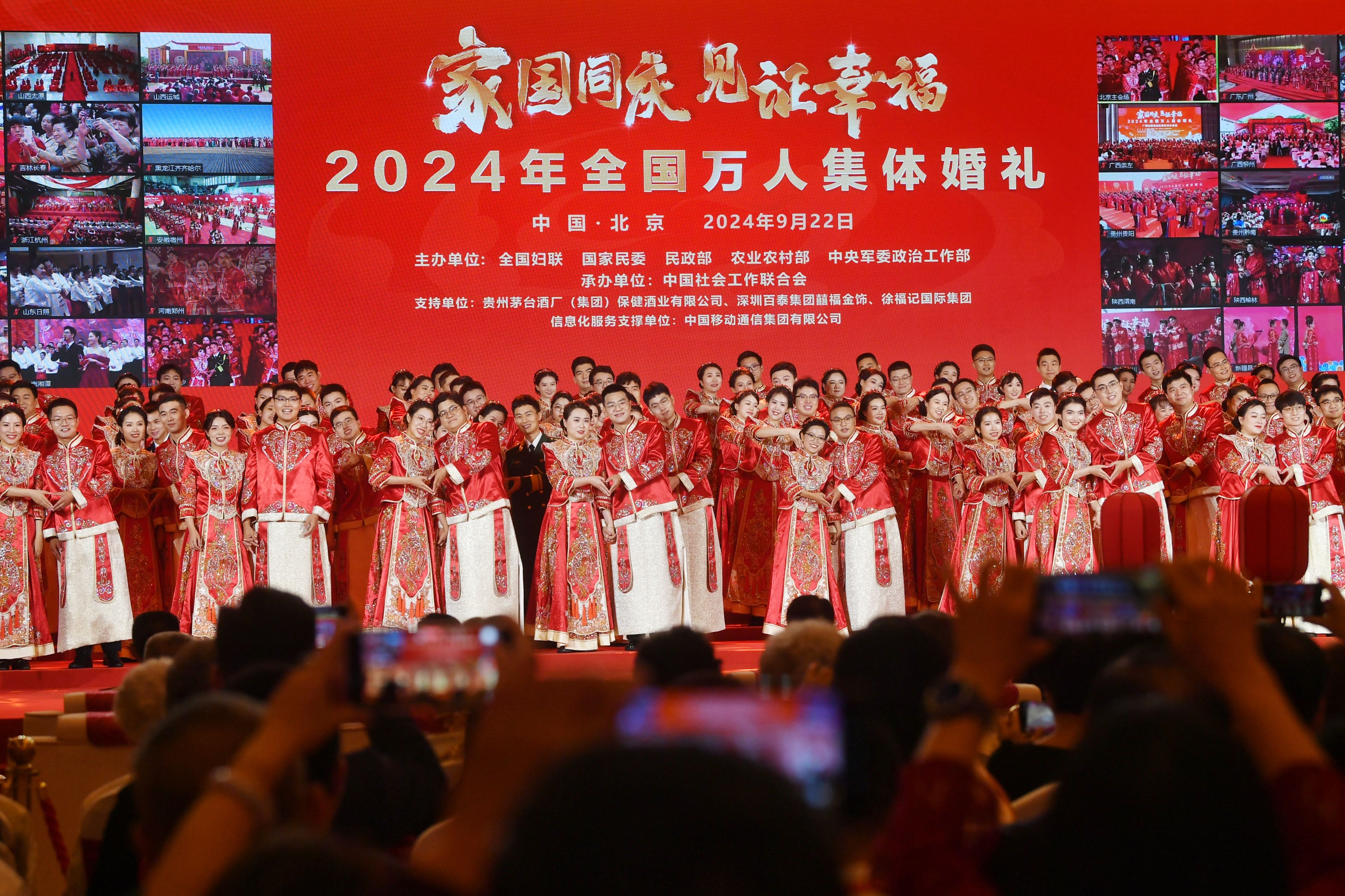 新京报讯(记者叶红梅)全国妇联、国家民委、民政部、农业农村部、中央军委政治工作部9月22日联合举办“家国同庆 见证幸福”2024年全国万人集体婚礼。婚礼在北京主会场、各省区市和新疆生产建设兵团49个分会场同步进行,来自全国各省区市和港澳台地区的5100多对新人参与这场规模盛大的中式集体婚礼。