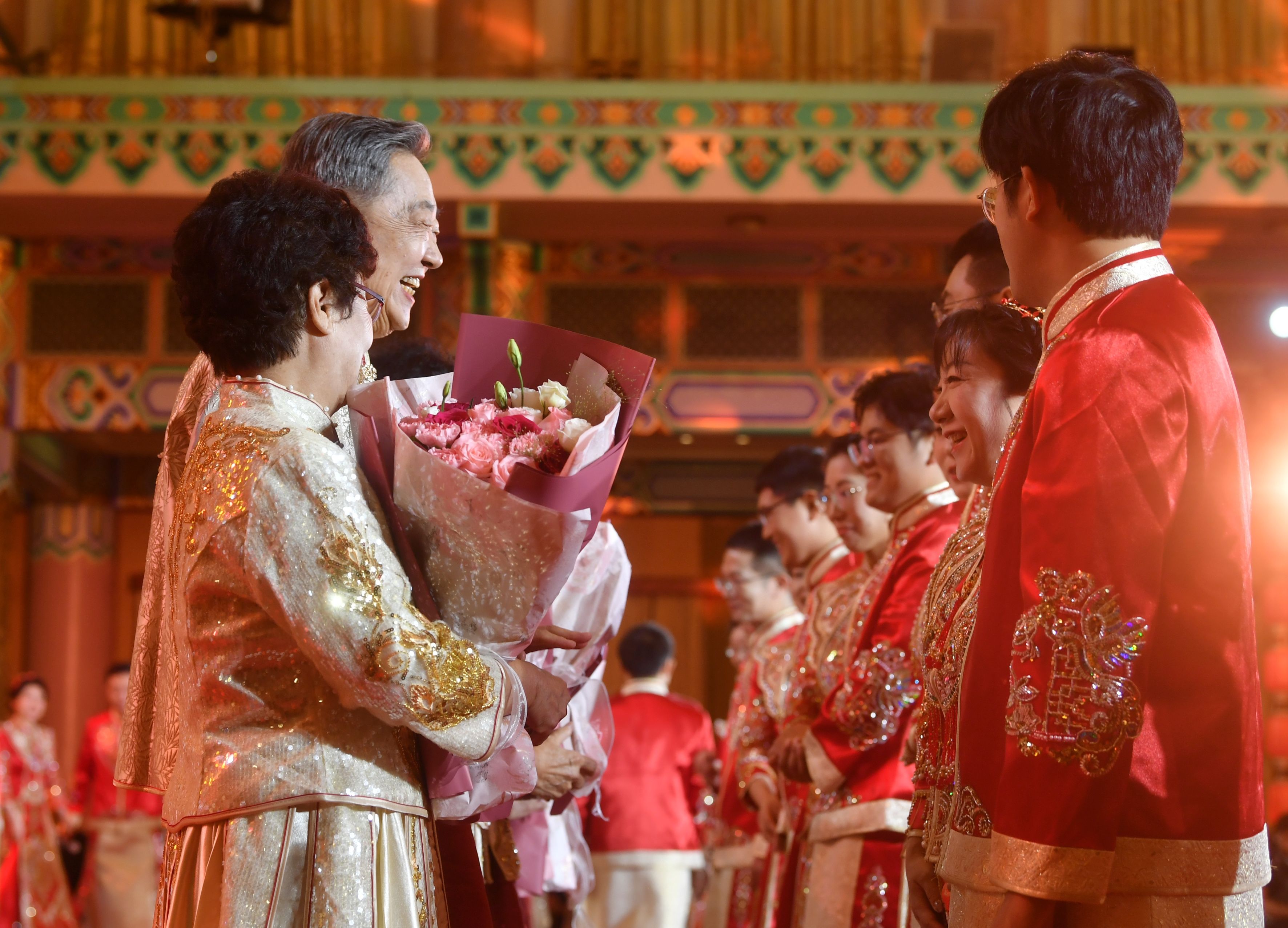 12对金婚伉俪登场,新人献花,金婚伉俪为新人送上祝福。新京报记者 王贵彬 摄