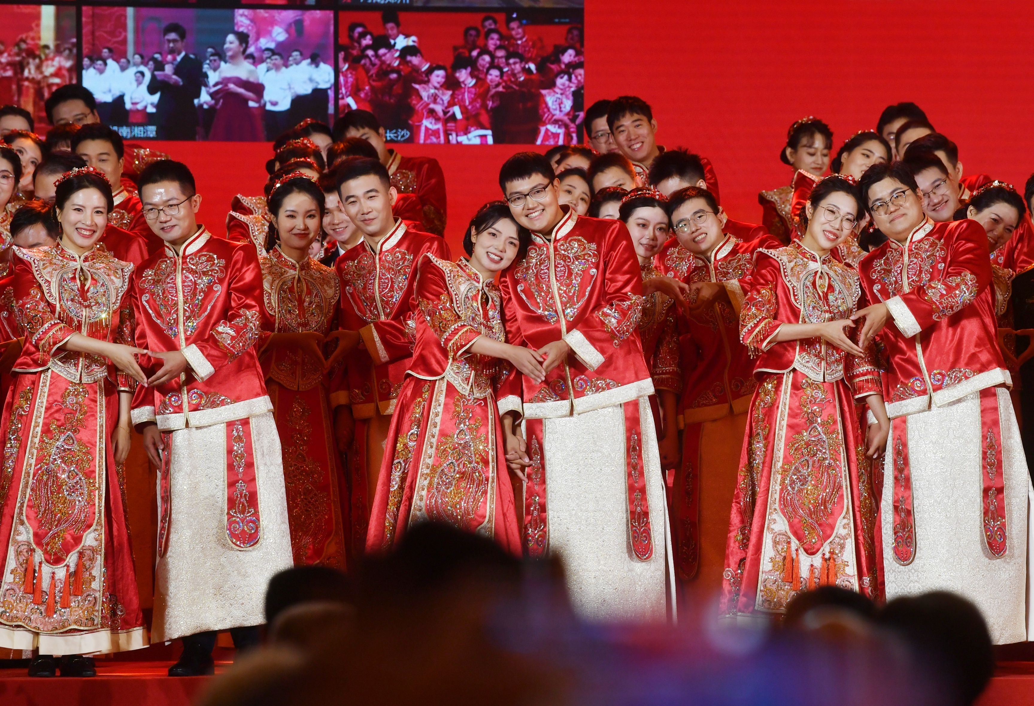 新人们来自28个民族,遍及科技、教育、文化、医疗、农业等各行各业。记者在北京主会场看到,所有新人均身着大红色的中式喜服,新娘们发型、妆容精致,新人们精神饱满,笑容洋溢。