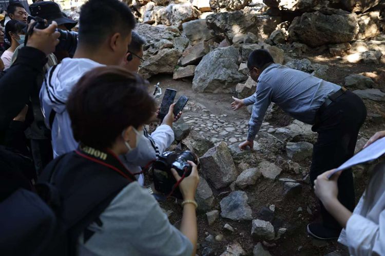 北京市考古研究院副院长张中华讲解一处发掘出来的路面遗迹。文源阁遗址位于圆明园西北部,曾是收藏《四库全书》的皇家藏书楼为主体的园林景观。