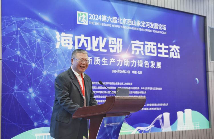 9月22日,以 “海内比邻 京西生态 –新质生产力助力绿色发展” 为主题的2024年第六届北京西山永定河发展论坛在北京市石景山区举办。众多领导和嘉宾出席主论坛,讨论和交流如何通过新质生产力推动绿色环保事业。图为石景山区委副书记、区长李新致辞。