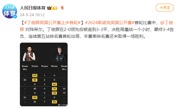 据人民日报体育微博消息,2024斯诺克英国公开赛首轮比赛中,丁俊晖对阵希尔。丁俊晖在2-0领先后被追到3-3平,决胜局鏖战一个小时,最终3-4告负,连续第五站排名赛首轮出局,本赛季排名赛还未取得一场胜利。