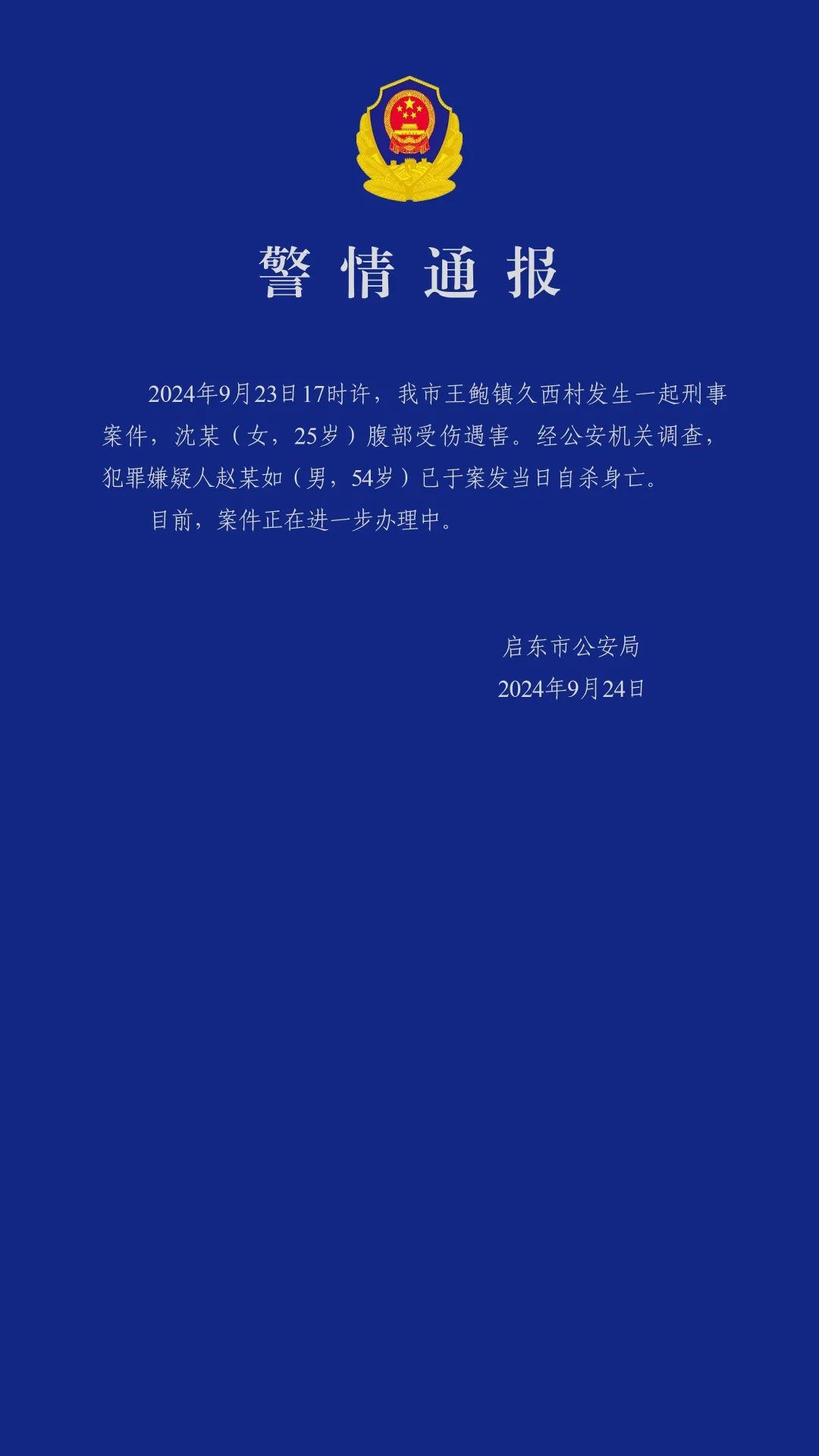 新京报讯 9月24日,江苏启东市公安局发布警情通报,9月23日17时许,启东市王鲍镇久西村发生一起刑事案件,沈某(女,25岁)腹部受伤遇害。经公安机关调查,犯罪嫌疑人赵某如(男,54岁)已于案发当日自杀身亡。