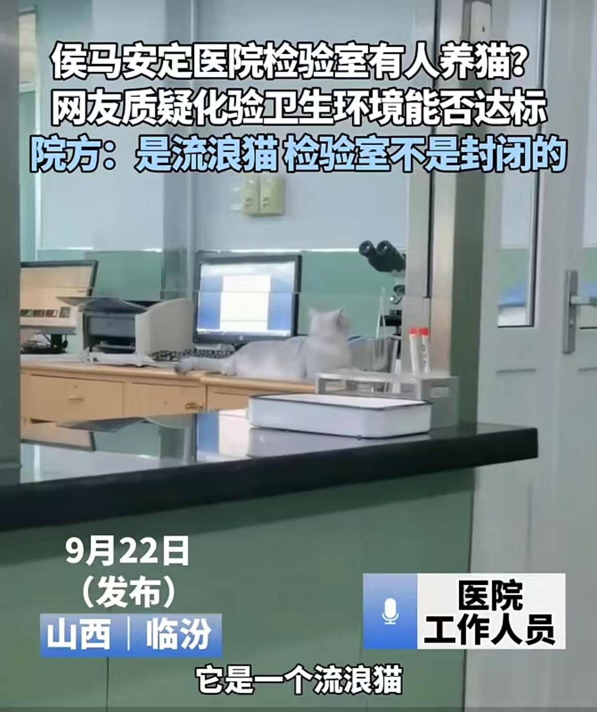 对此,侯马安定医院一名工作人员回应称,视频中的猫是流浪猫,“(化验室)不是封闭的,和外界是连通的。”此言一发,再次引发网友热议,“问题不是流浪不流浪,问题是实验室化验室不能有猫。”