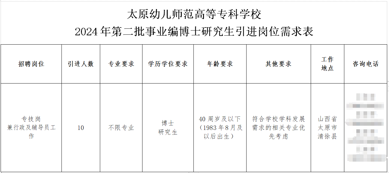 太原幼儿师范高等专科学校2024年第二批事业编博士研究生引进岗位需求表。图/学校官网
