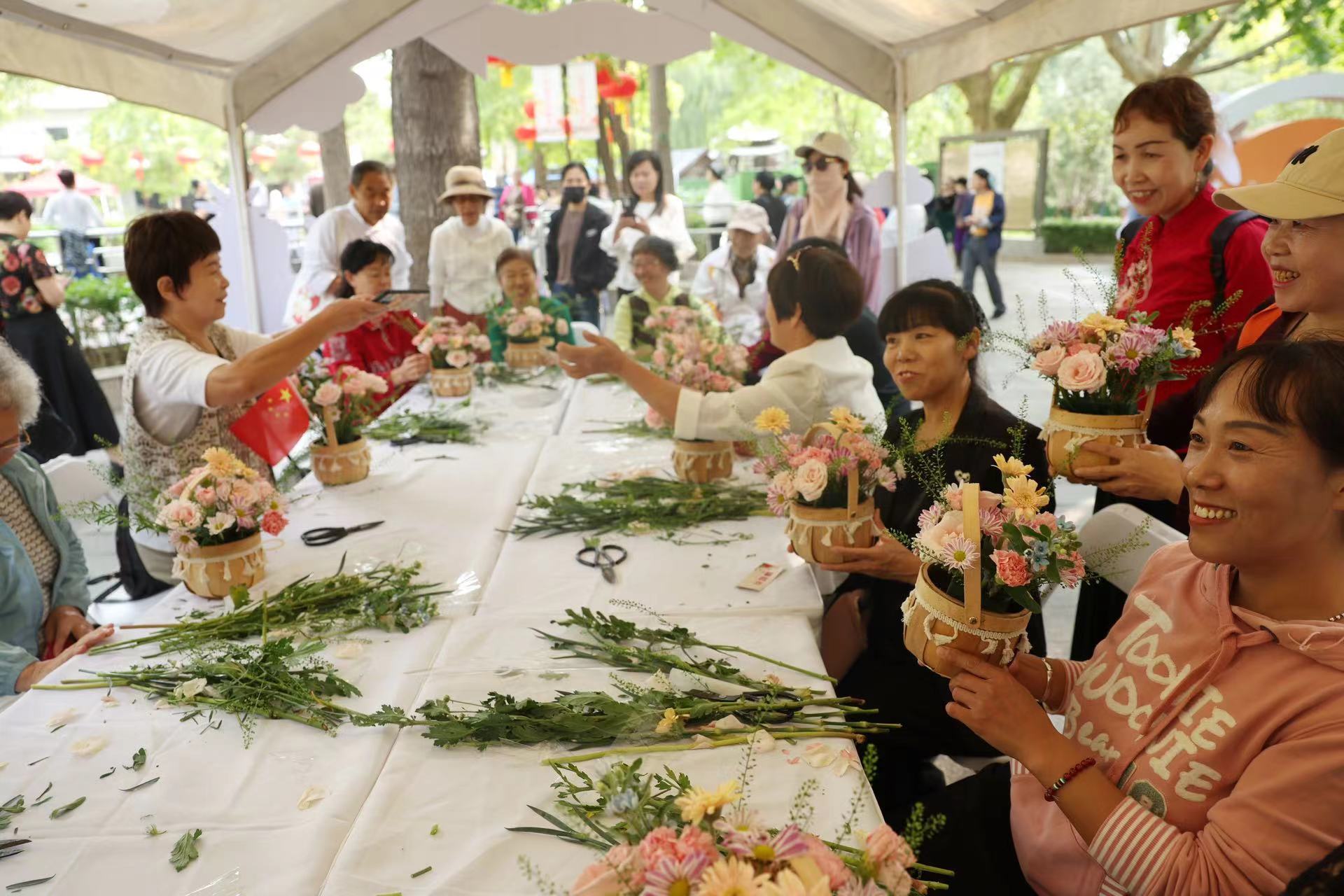 市民在现场体验插花的活动。团结湖公园园长陈凯介绍,今年的游园会共亮相了200多种、1.4万株菊花,花期预计持续到10月底。游园会还设置了多个创意打卡点,包括彩虹景观、环波桥、花海长廊等。