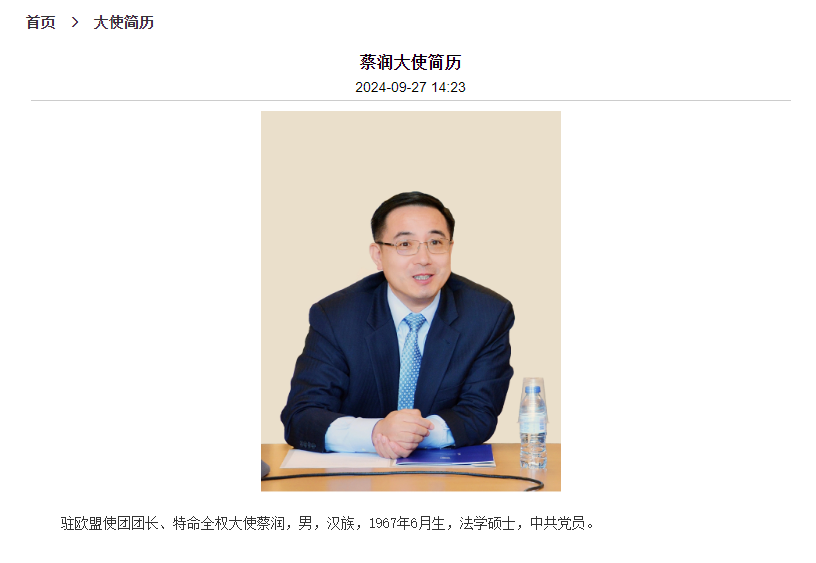 新京报讯 据中国驻欧盟使团官网“大使简历”栏目显示,蔡润已任中国驻欧盟使团团长、特命全权大使。