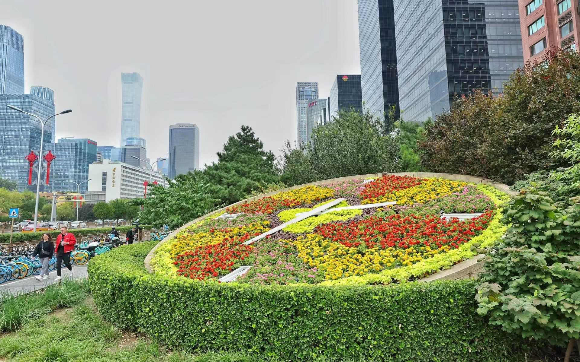 假日期间,驾车行驶到国贸桥的司机朋友将欣赏到一片7公里的“花海”。朝阳区城市管理委员会城市景观管理科科长杨伟毅介绍,7公里的花箱为近年来国贸桥首次悬挂,涵盖国贸桥南北主干道双向、东西主干道双向以及盘桥匝道。主体花卉布置东西向为粉色球菊,南北向及匝道为一品红。“通过桥体挂花方式增加桥区色彩,提升立体绿化效果,更好地突出花园城市的景观风貌。”