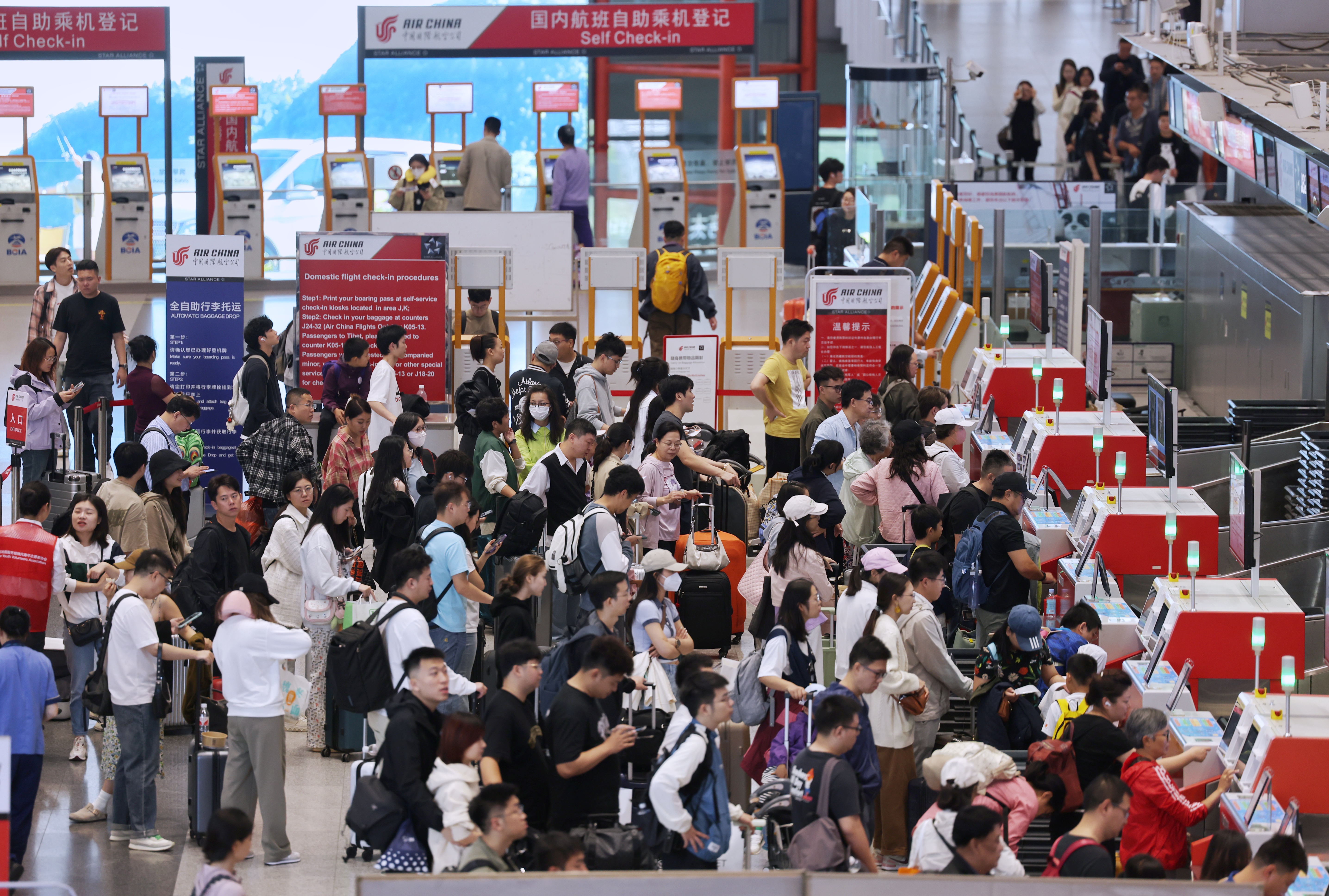 首都机场运行控制中心运行管理业务经理侯羽泽介绍,今年国庆假期,以探亲旅客、旅游团和家庭团体集中出行为主。为了确保旅客顺畅出行,首都机场重点关注航班和客流高峰时段,动态调整值机区、问讯柜台和安检前端等旅客流程关键节点的服务引导人员。同时根据客流情况增加机场大巴发车频次,及时启动出租车保点、机场巴士兜底等保障。