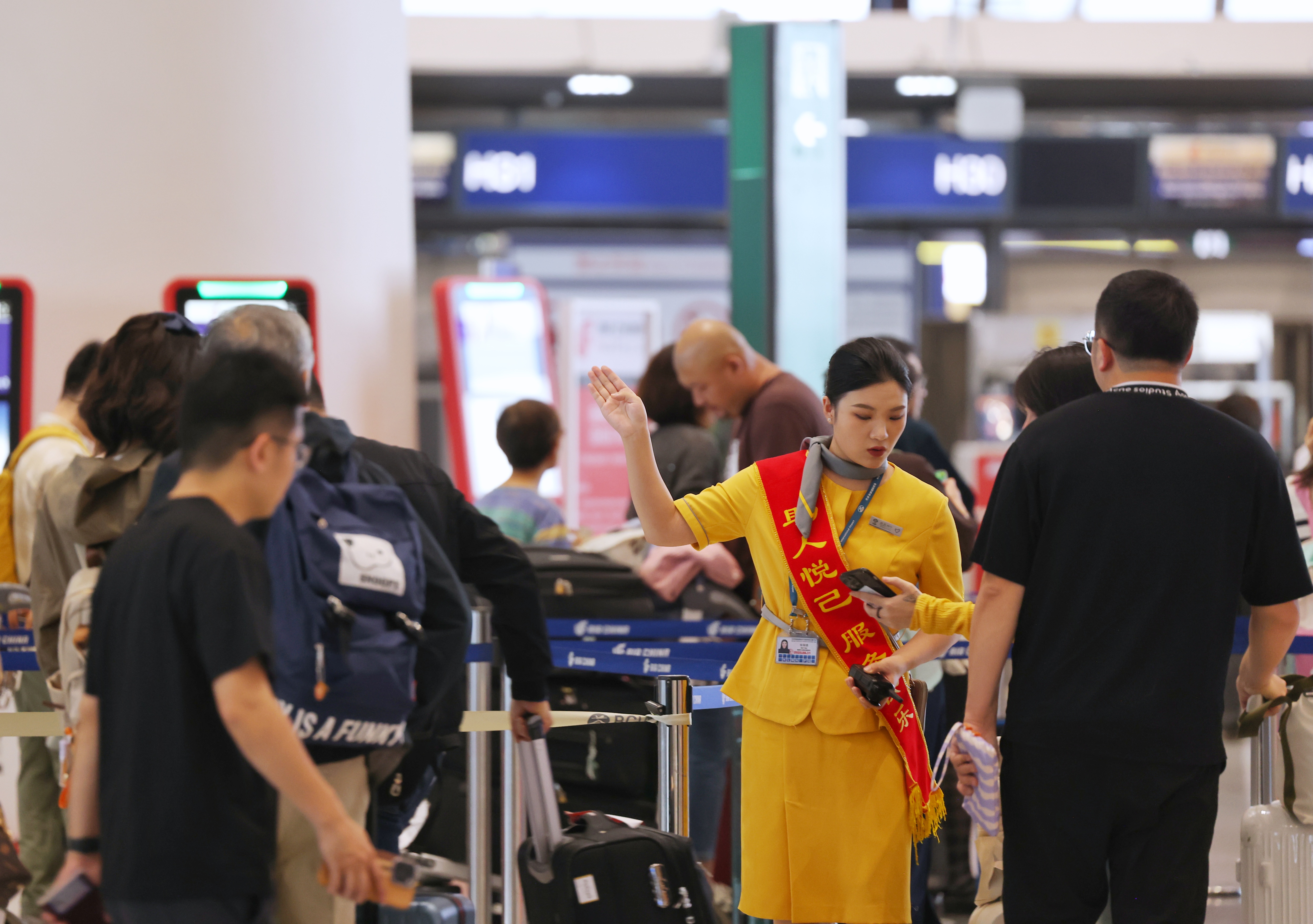 机场服务大使为旅客指引。新京报记者 陶冉 摄