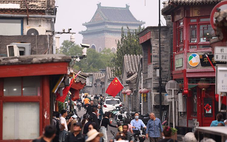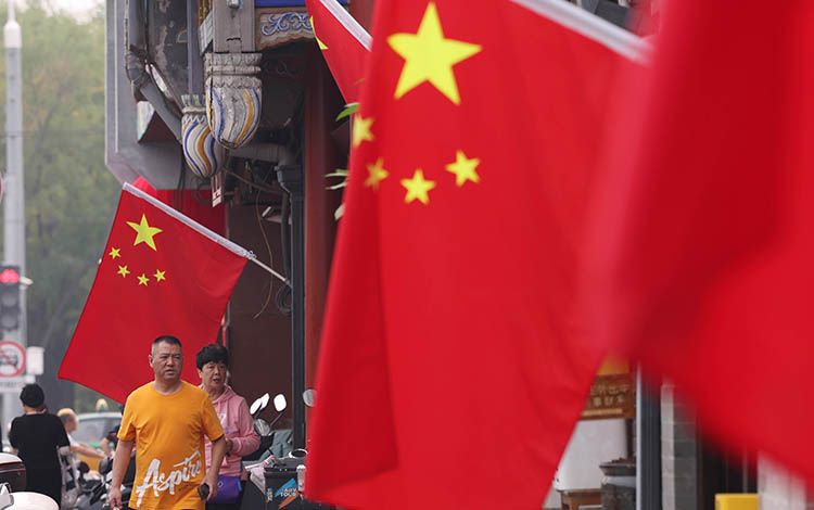 地安门外大街,市民行走在国旗间。