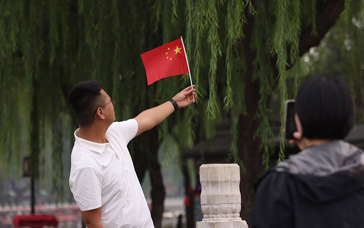 北京什刹海银锭桥上,游客手举国旗合影留念。