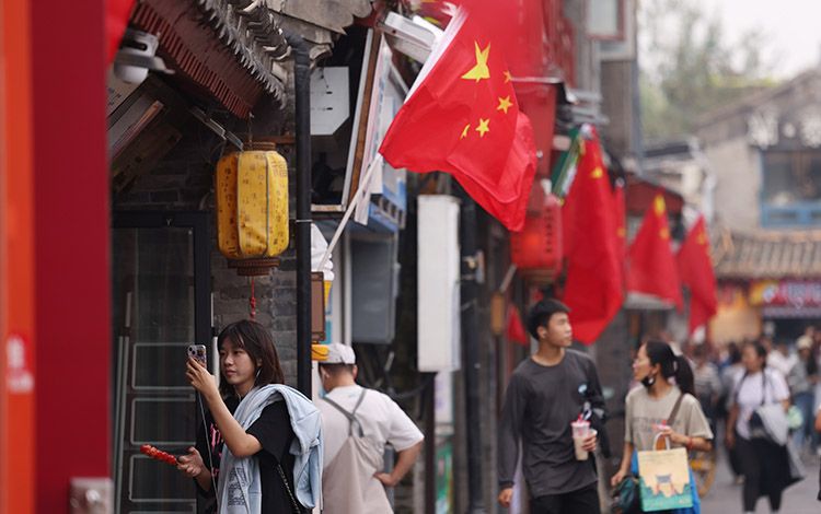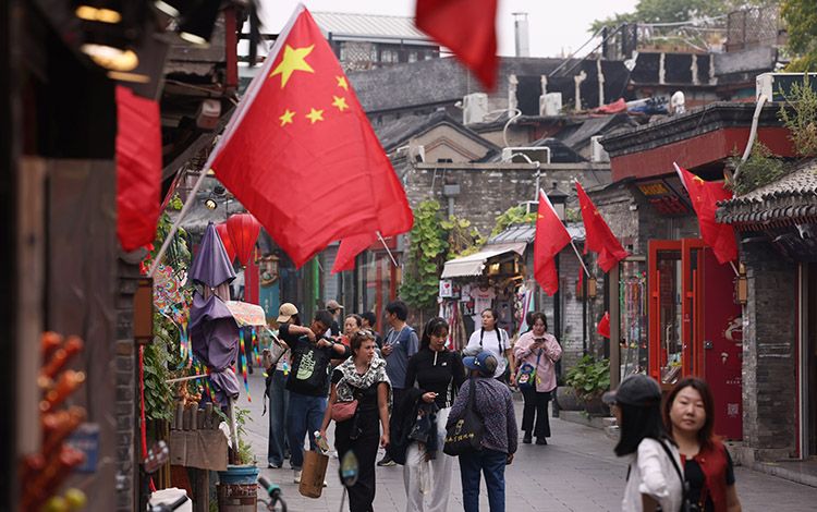 9月29日,北京什刹海烟袋斜街内国旗飘扬,国庆节将至,大小街巷都陆续挂满国旗,洋溢着喜庆的气氛。