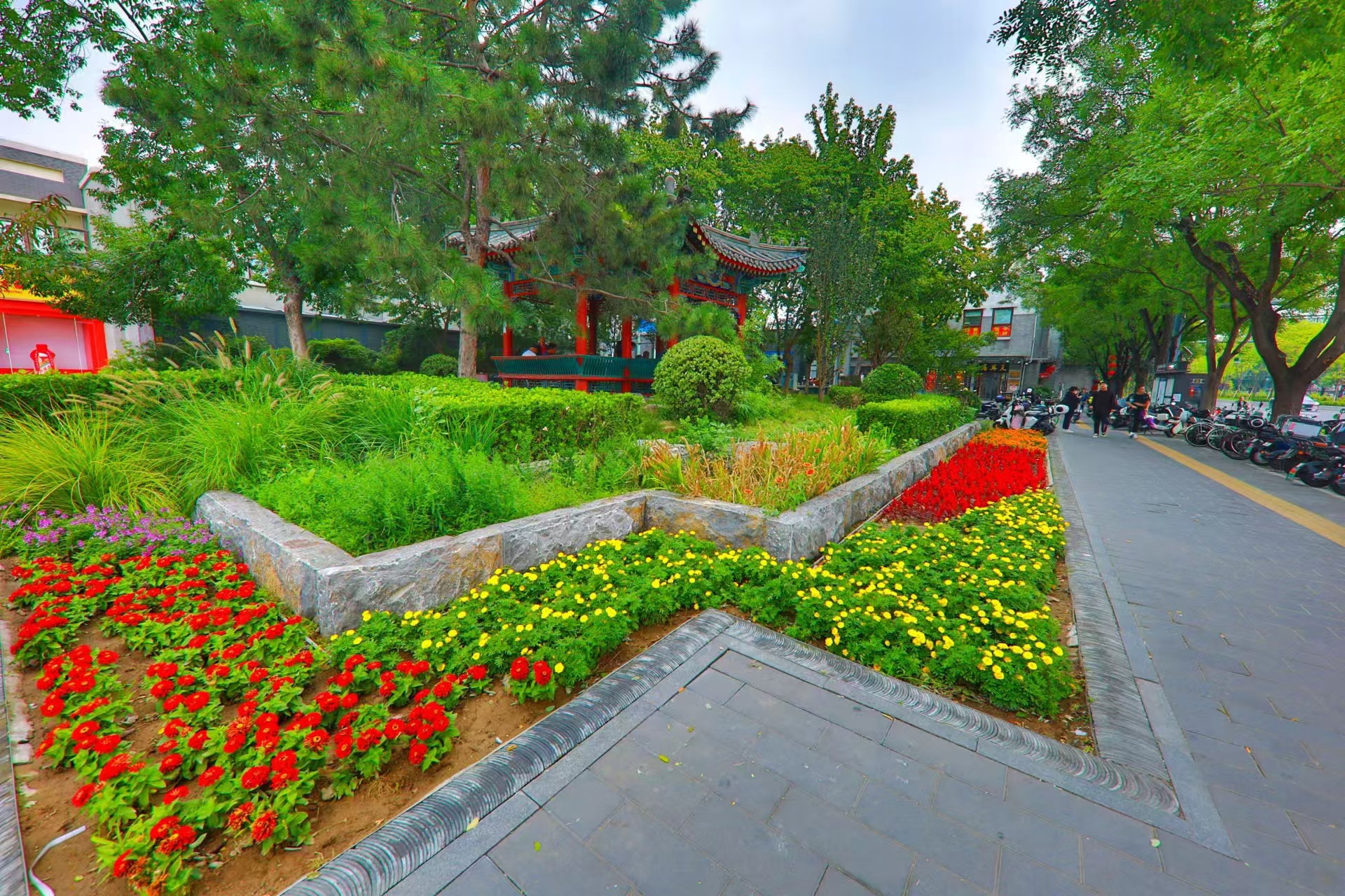 张自忠路地铁口附近路段进行花卉布置。东城区园林绿化局供图