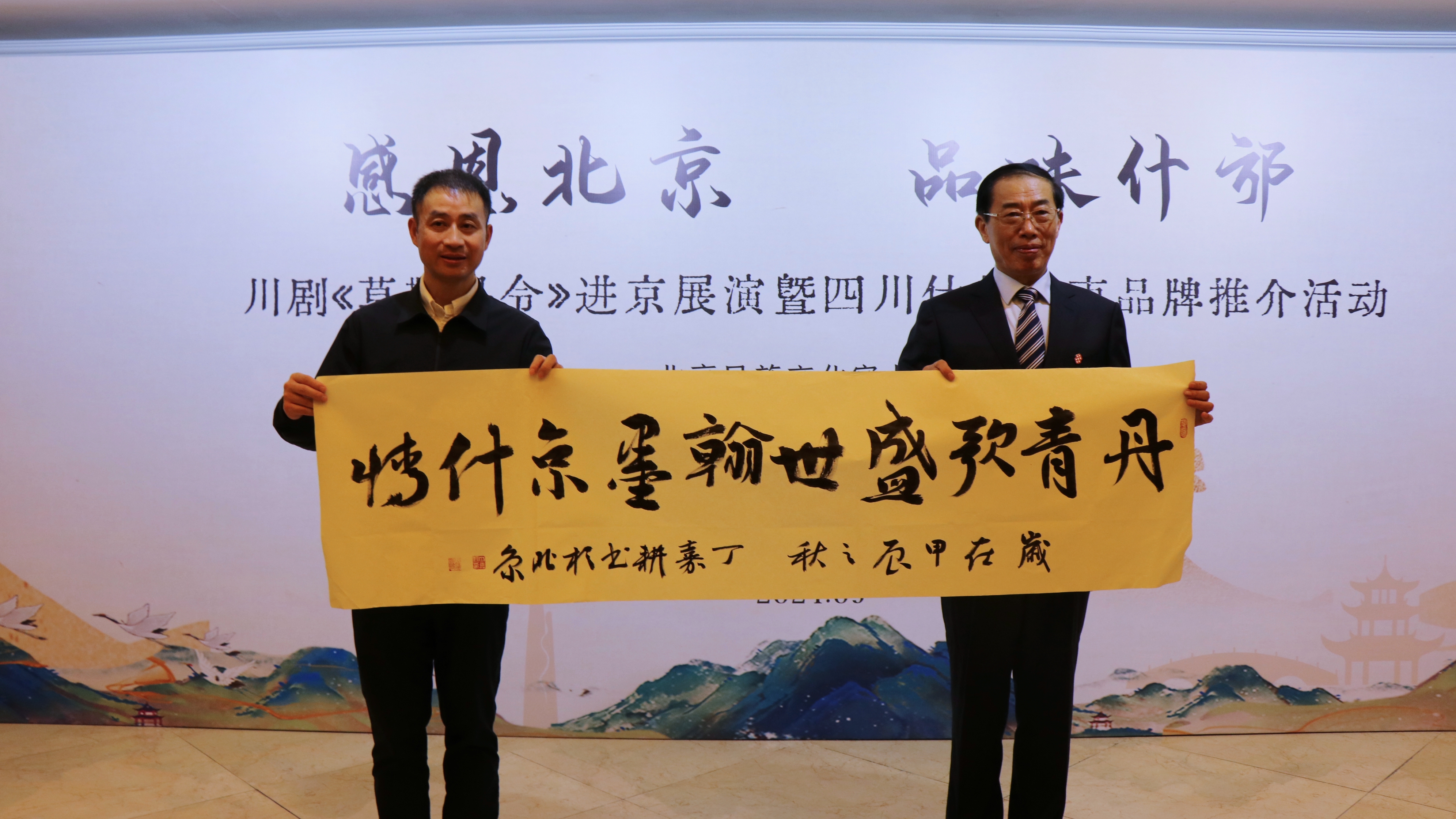 北京市书法家协会副主席、北京市文联理事丁嘉耕联袂什邡书法家冷玉成现场挥毫泼墨共同书写了“丹青歌盛世 翰墨京什情”。