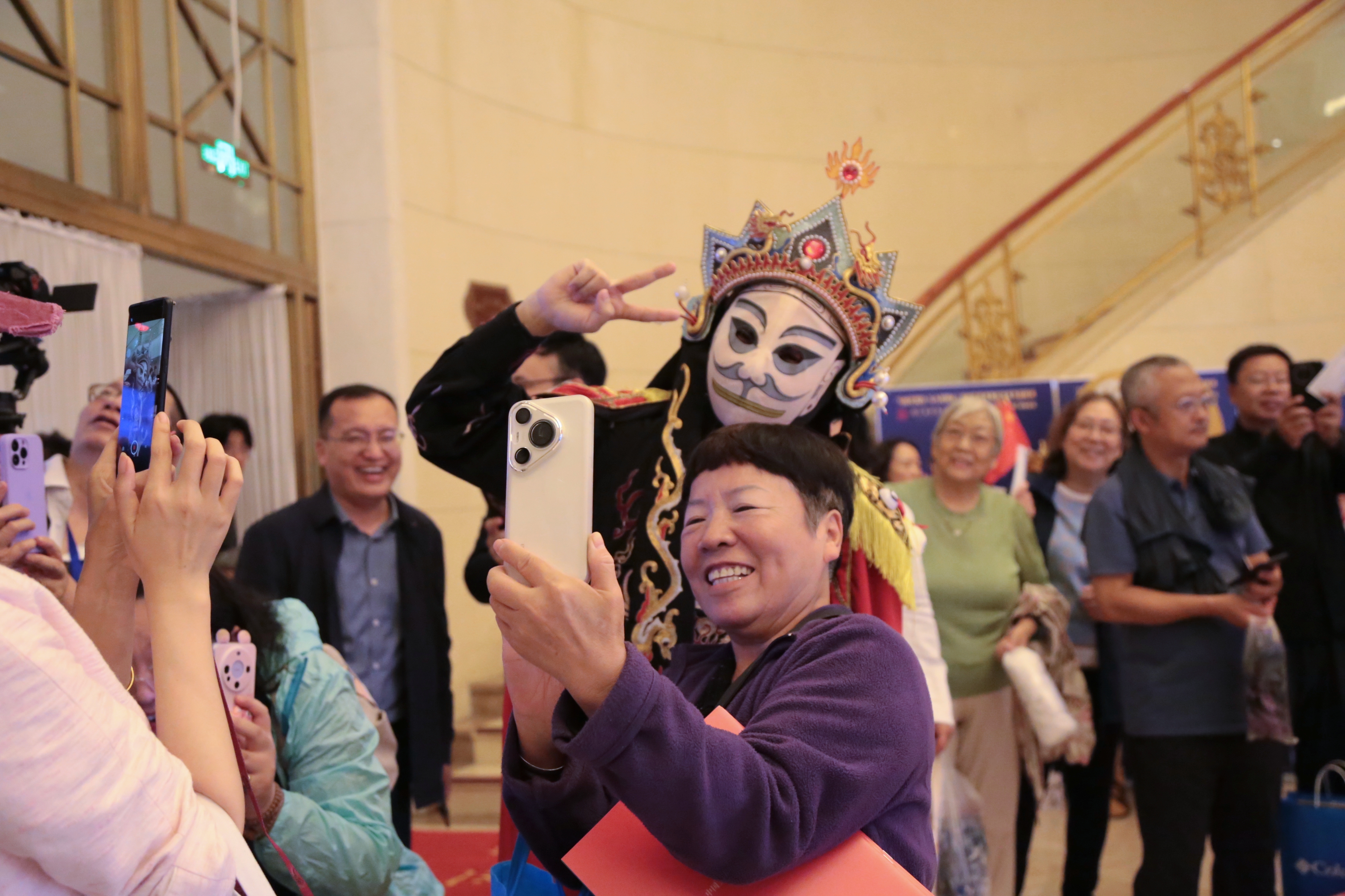 现场观众与川剧变脸演员互动。