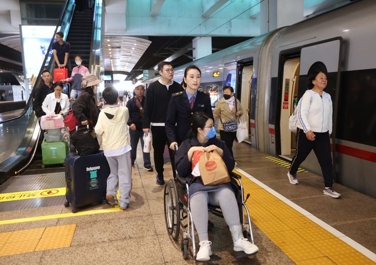 10月1日,北京南站,工作人员护送行动不便的旅客上车。
