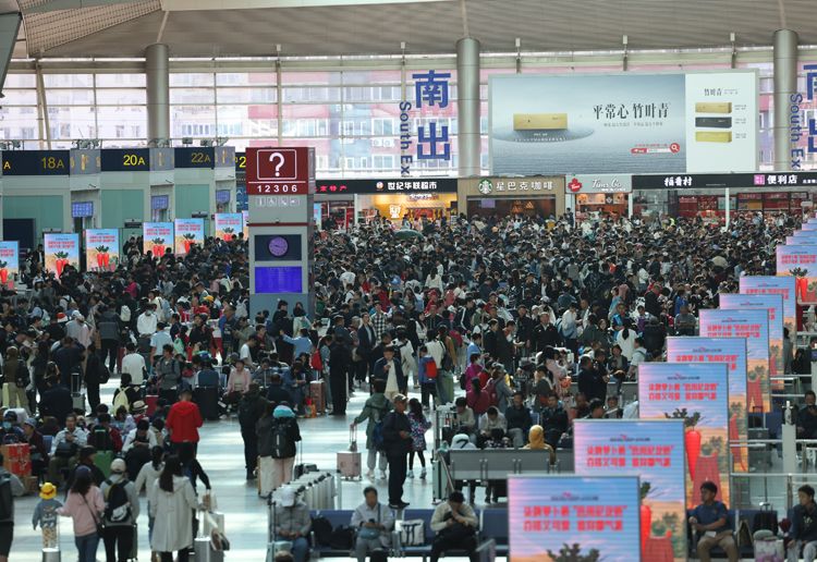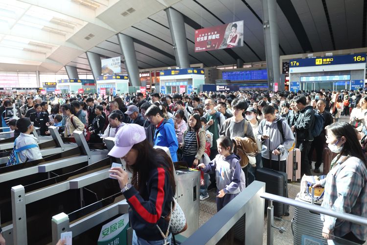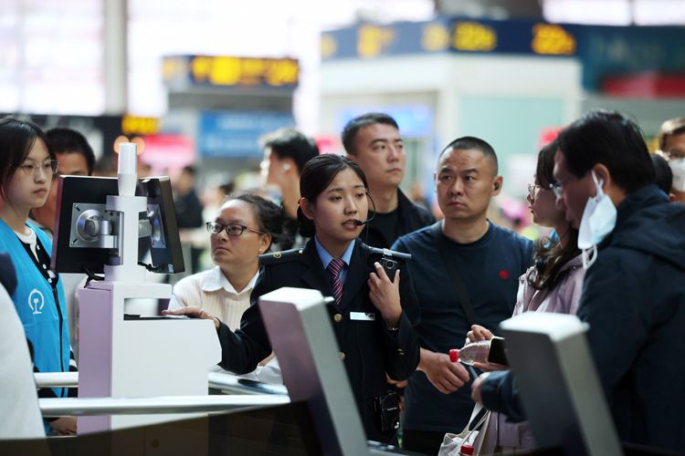 10月1日,北京南站,旅客排队进站。为应对高峰,北京南站持续优化旅客进站流线,动态调整安检通道,开启快速进站厅,根据客流调整开关时间,缩短检票进站时间。