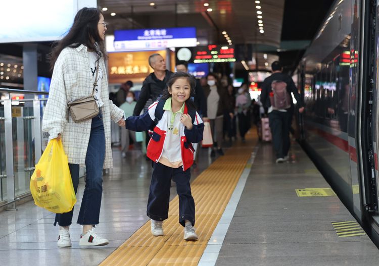 10日1日,北京南站站台,小朋友高兴地登上列车。当日北京南站预计发送旅客23.8万人次。