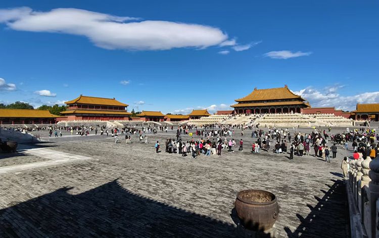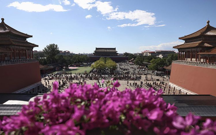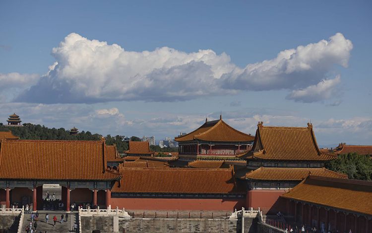 白云飘在故宫上空。北京市气象台10月1日9时发布: 今天白天晴转多云,山区有阵雨,北风三四级,阵风七级左右,最高气温18℃;夜间多云转晴,北风一二级,最低气温7℃。大风蓝色预警中,今天白天北风明显。