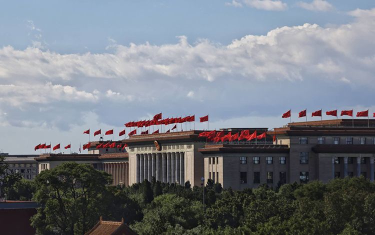 10月1日上午,人民大会堂上空红旗飘飘。北京天空现超美蓝天白云,蔚为壮观。