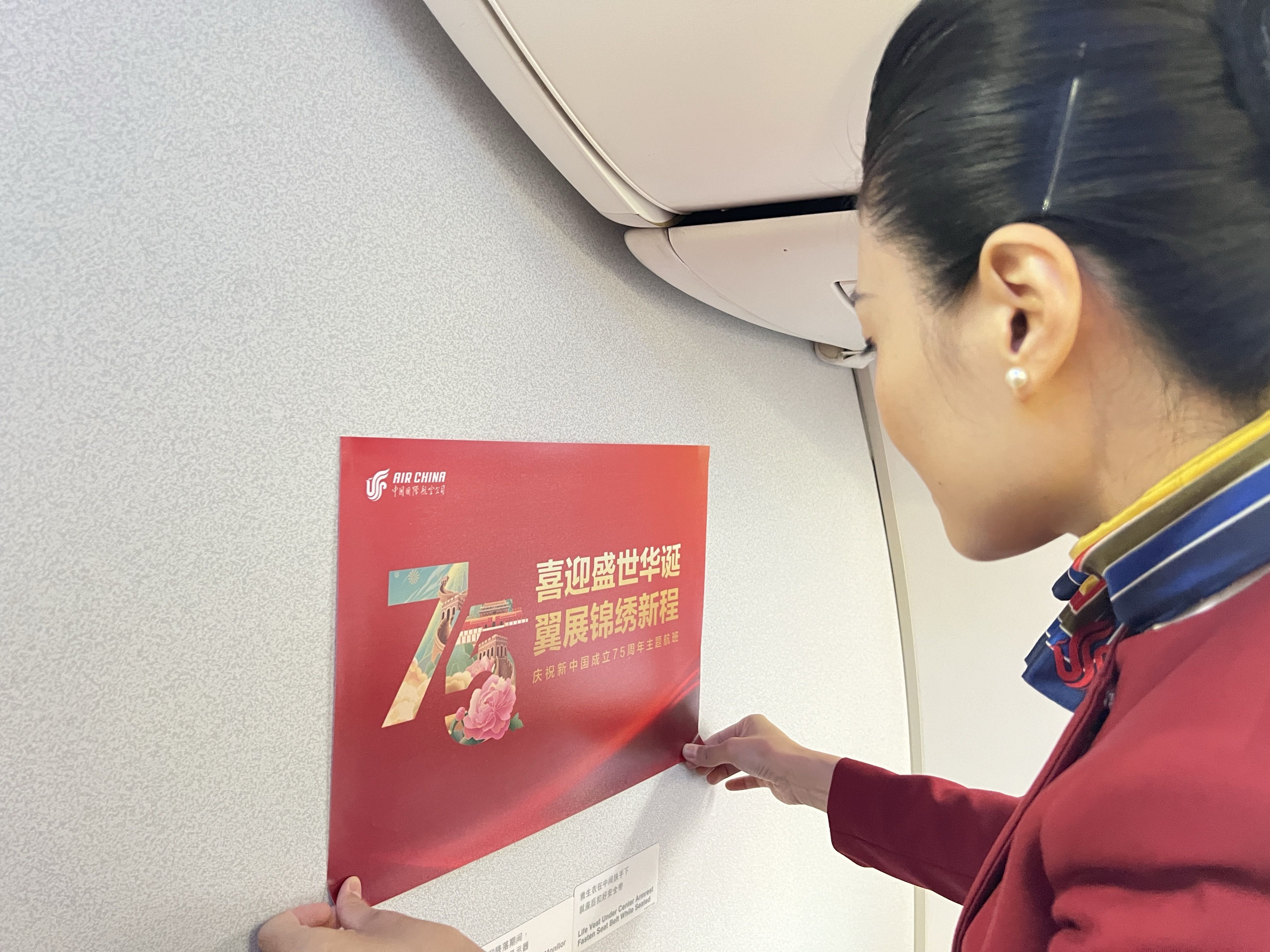 在北京-南昌CA1537航班和北京-延安CA1279航班上,国航围绕红色目的地开展了国庆主题航班活动。航班起飞前,国航向旅客赠送了表达国航人对祖国深情的“AIR CHINA爱CHINA”号彩绘飞机模型。机舱内鲜艳的五星红旗、国庆元素主题海报,营造出浓厚喜庆的节日氛围。伴随特别定制的机长广播和国庆主题餐食,机组成员和旅客们共同祝福祖国母亲生日快乐,祝愿祖国繁荣富强、国泰民安。旅客通过手机、电脑等电子设备登录国航机上网络平台,观看国庆主题相关节目,欣赏影视佳作,了解详尽的国庆旅游攻略及美食推荐。