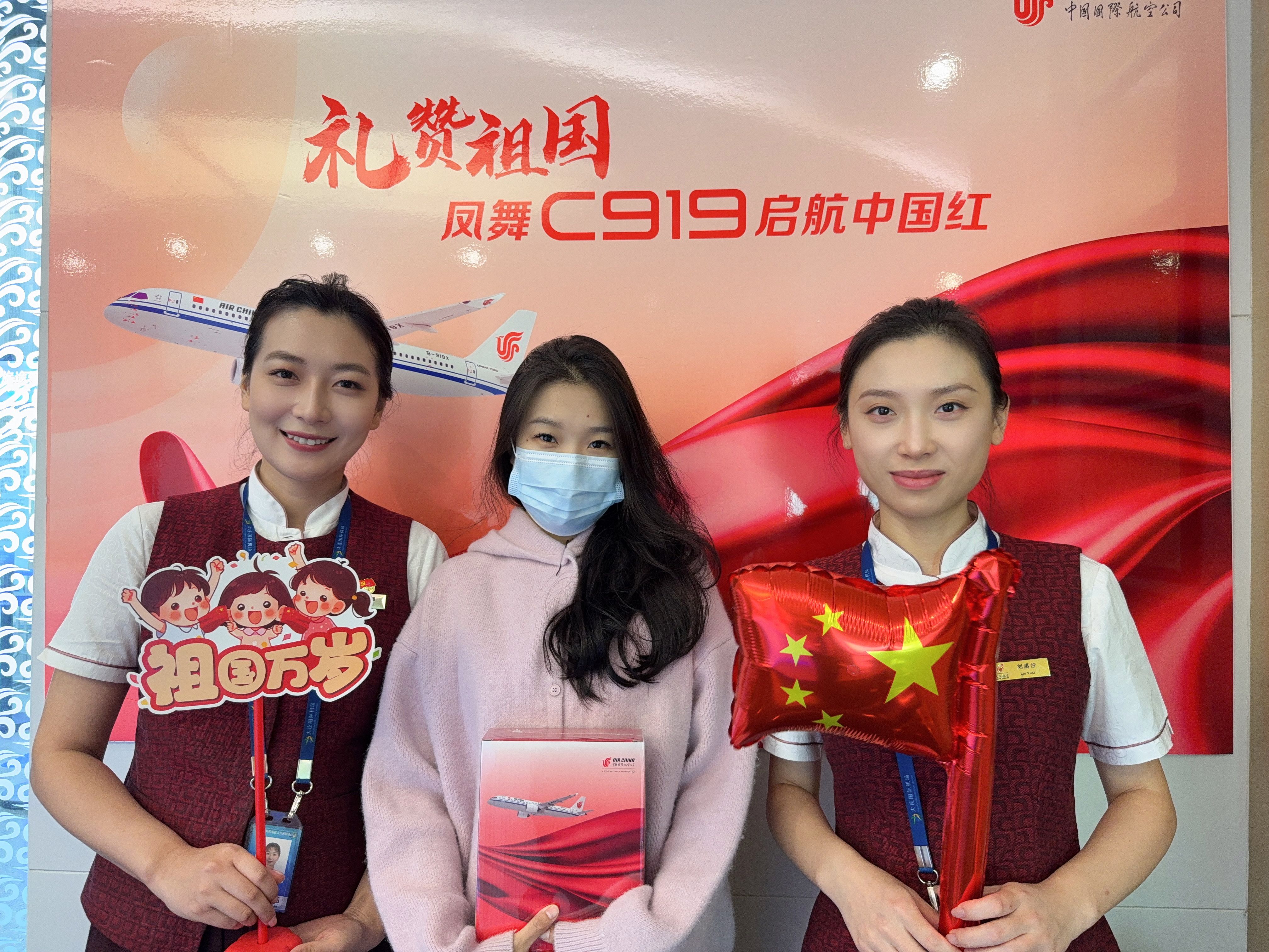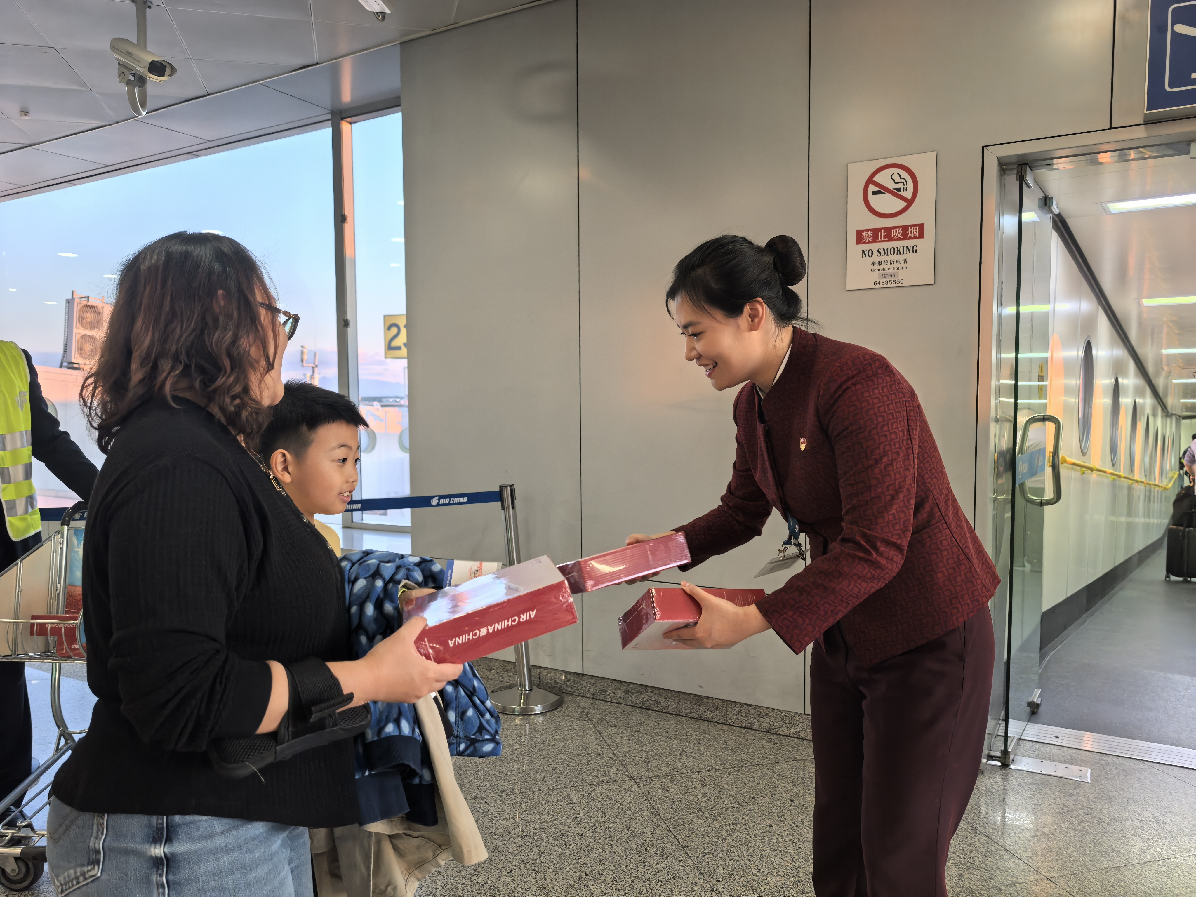 航班起飞前,国航向旅客赠送了表达国航人对祖国深情的“AIR CHINA爱CHINA”号彩绘飞机模型。