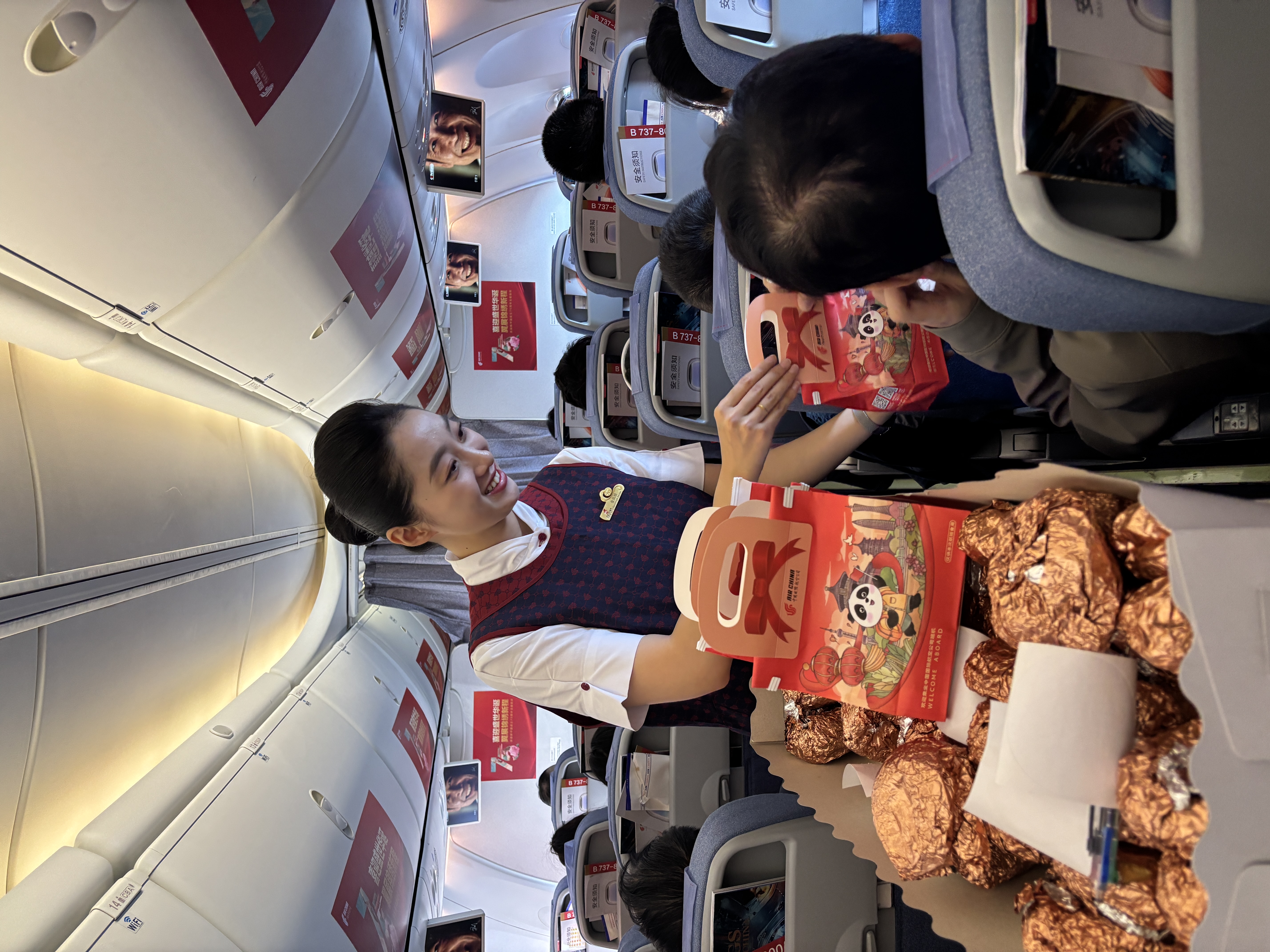 在北京-南昌的CA1537航班上,乘务员为旅客发放特色餐食。