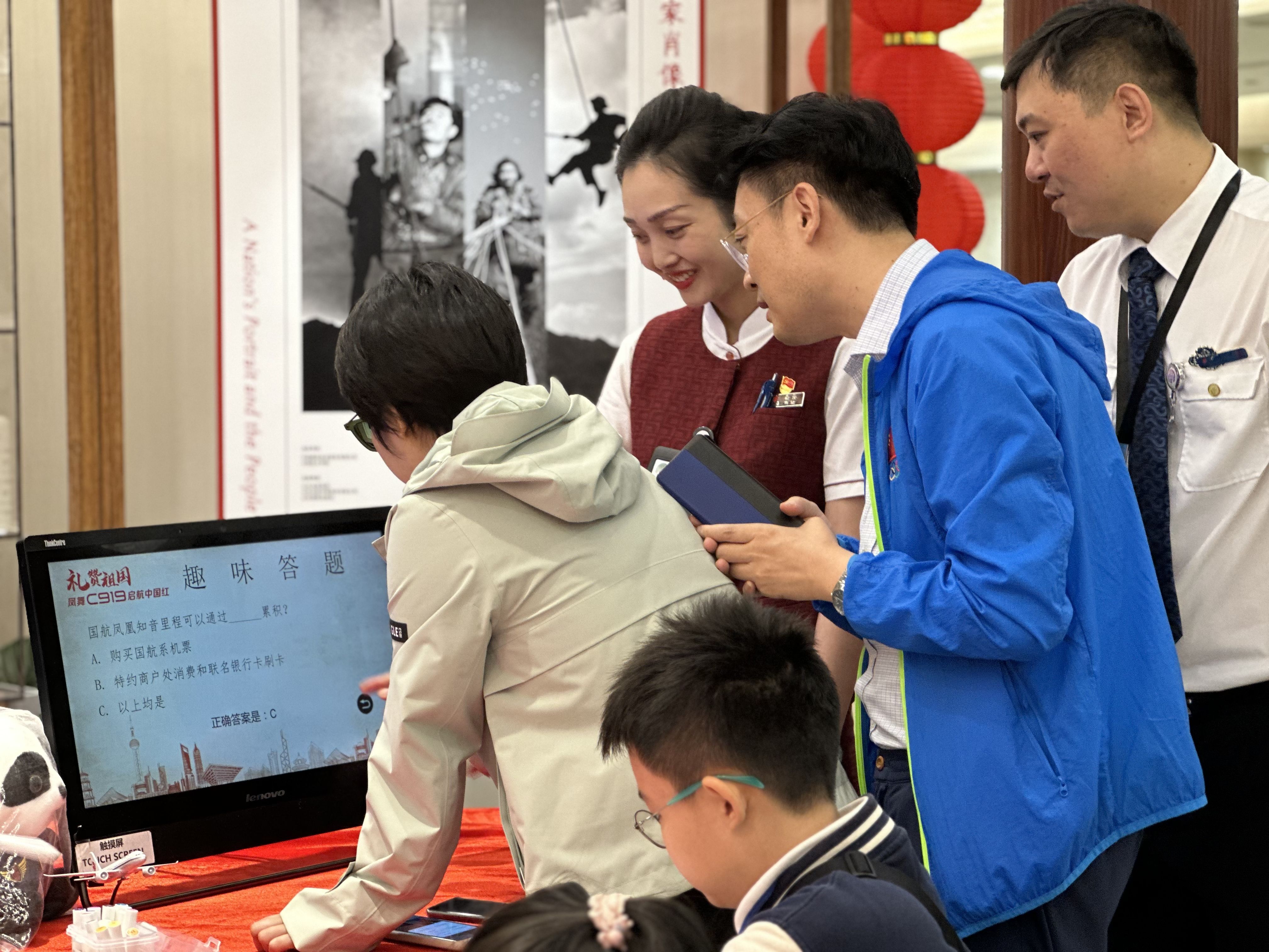与此同时,国航在北京、成都(双流、天府)、杭州、重庆、天津、上海(虹桥、浦东)、武汉、贵阳、拉萨、温州、大连以及呼和浩特12地自营贵宾休息室,举办了主题为“礼赞祖国,凤舞C919,启航中国红”的旅客体验活动,意在让更多的旅客了解国产大飞机,与国航共筑蓝天梦,共同祝福祖国。活动现场,工作人员邀请旅客参与“与你同框”,记录与国航C919的美好瞬间;邀请乘坐过国航C919的旅客分享乘机体验,在社交媒体留下精彩印记;开展“你心中的大飞机”活动,邀请小旅客在画纸上为国航C919涂色,描绘出国产大飞机梦想启航的绚丽画卷;开展“C919知识有奖问答”,旅客也收获了国航赠送的专属文创产品。