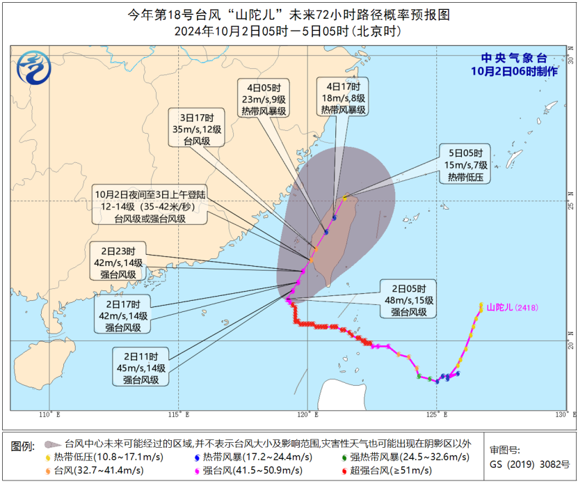 今年第18号台风“山陀儿”未来72小时路径概率预报图(10月2日05时-10月5日05时)。图/中央气象台