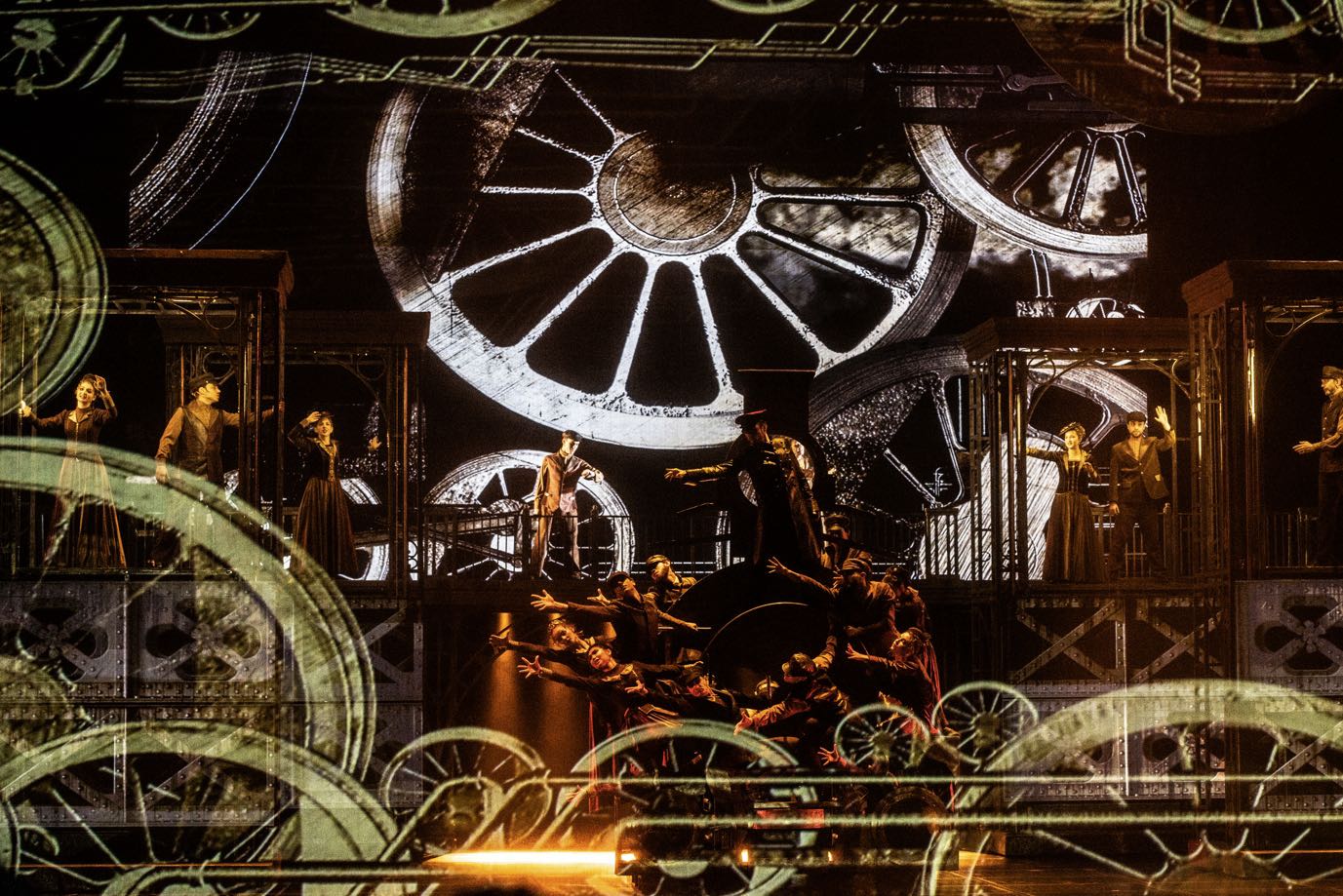 该剧的舞台运用了多种高科技,九块屏幕、重达数吨的金属结构和几百个照明装置在舞台上组合在一起,创造出令人印象深刻的“多媒体拼图”:从19世纪的歌剧院到溜冰场、豪华的宫殿到夏季的乡村,逼真的场景让观众身临其境,一秒穿越。运用“火车头”和“齿轮”等舞美元素,展现歌词中关于“人生列车”的表达,更在结局前为观众带来令人难以置信的壮观和戏剧性的高潮。
