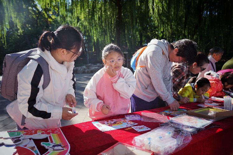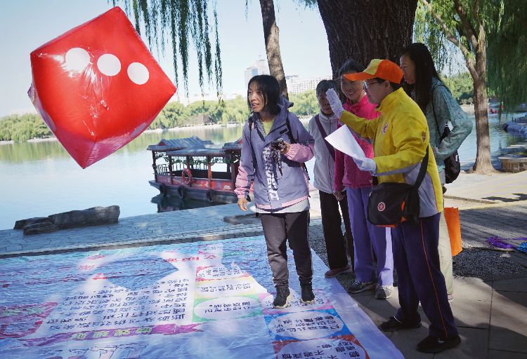 10月3日,玉渊潭公园,游客参加“文明游园飞行棋”互动游戏。国庆假期前两天,北京市属11家公园和中国园林博物馆累计接待游客超102万人次。
