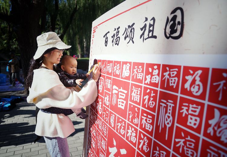 “百福颂祖国”活动,通过手写100种字体的“福”字,表达对祖国的祝福。一位妈妈抱着孩子写“福”字。