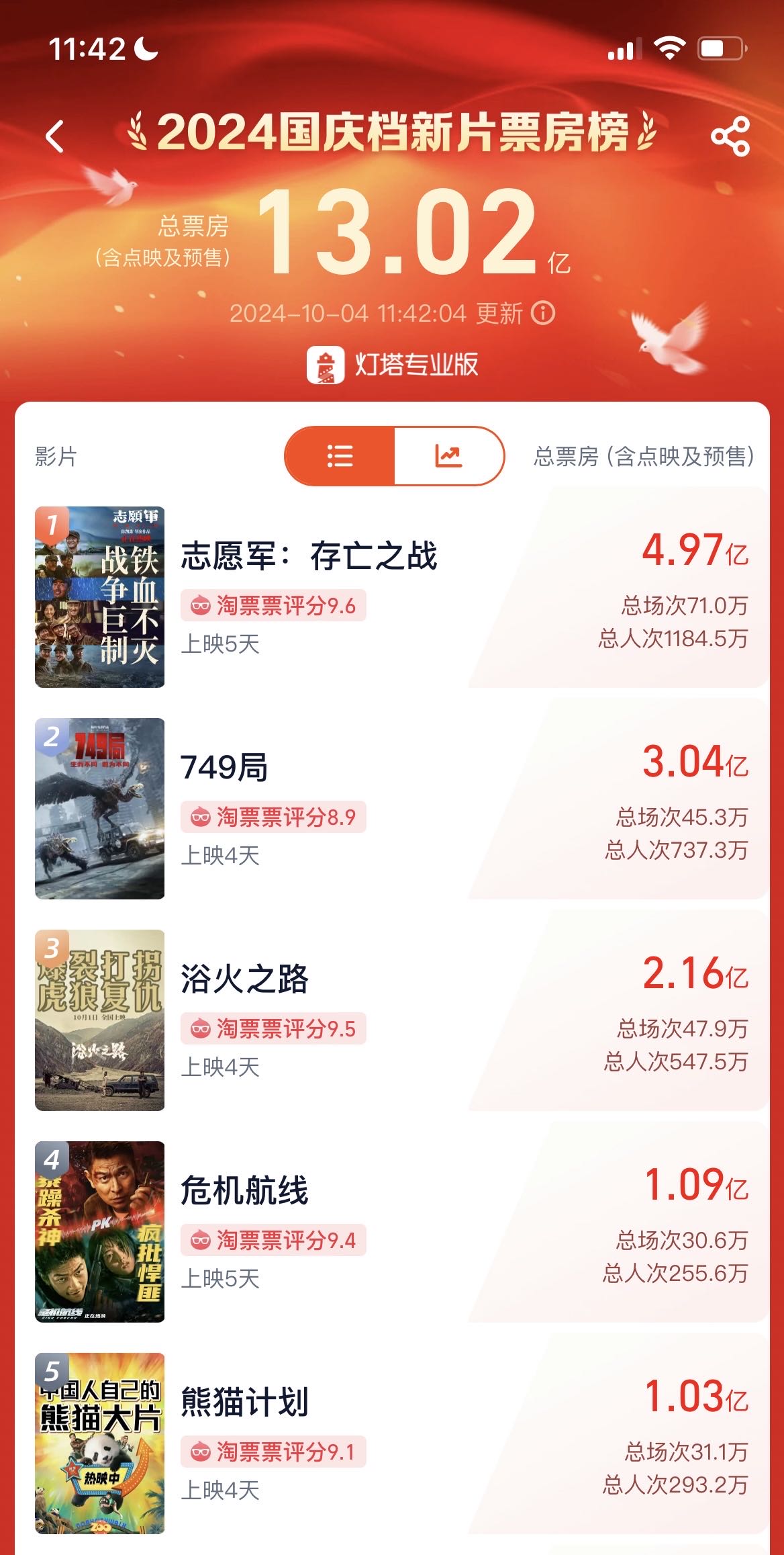 2024国庆档新片总票房破13亿,已有5部影片票房破亿