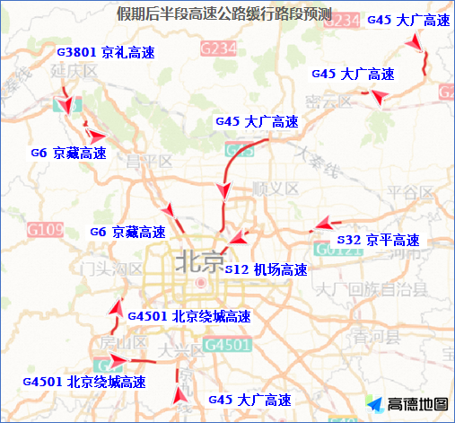 预计10月5日至7日的14至19时,京藏、京承、京港澳、京沪、京开、机场等高速进京方向的交通压力将有所增加,京藏高速康庄、居庸关、西三旗、北沙滩,京承高速黄港、太阳宫,京港澳高速琉璃河、西道口,京开高速玉泉营、新发地、榆垡等路段都是进京方向车流集中的点段。