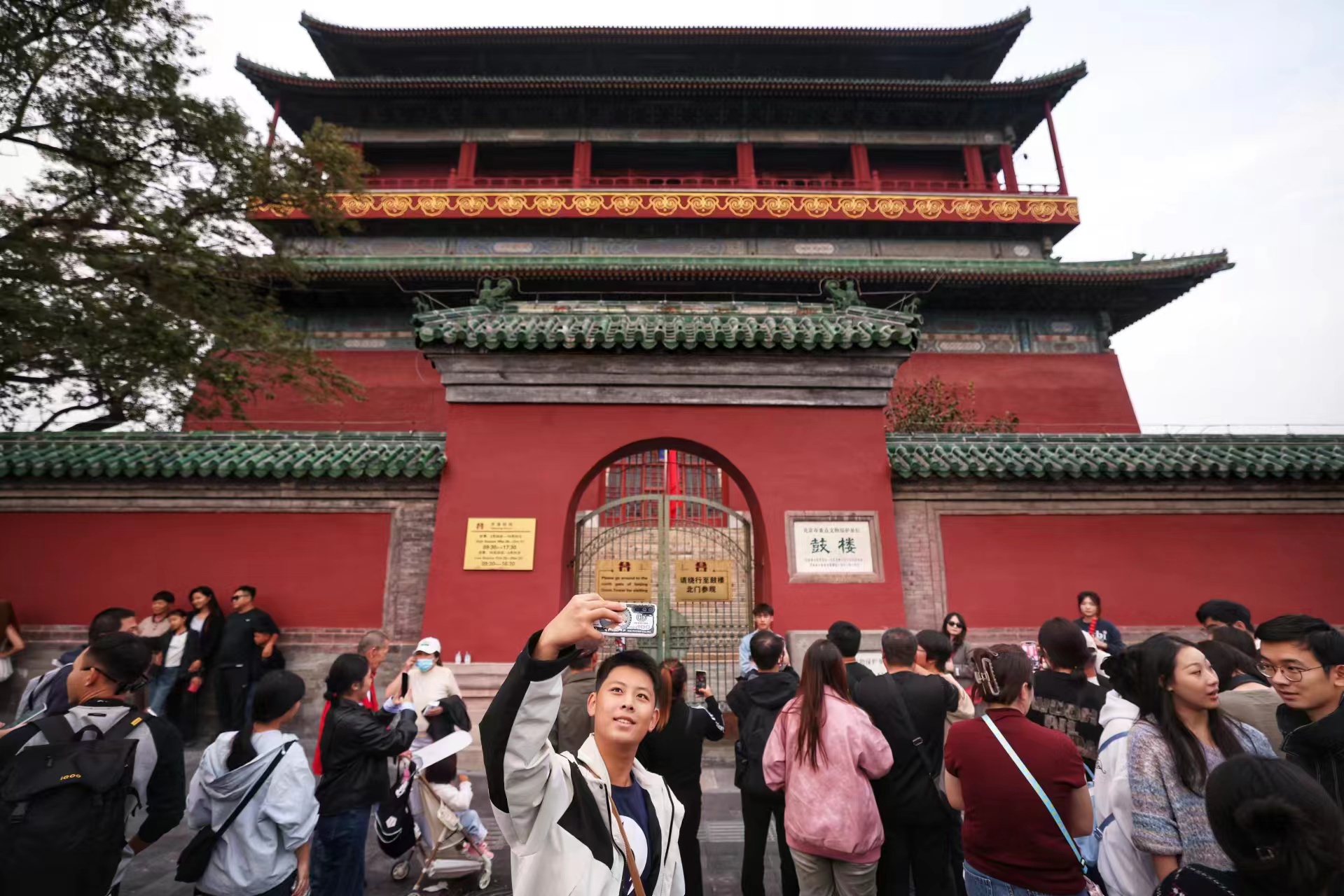 游客在鼓楼前打卡拍照。