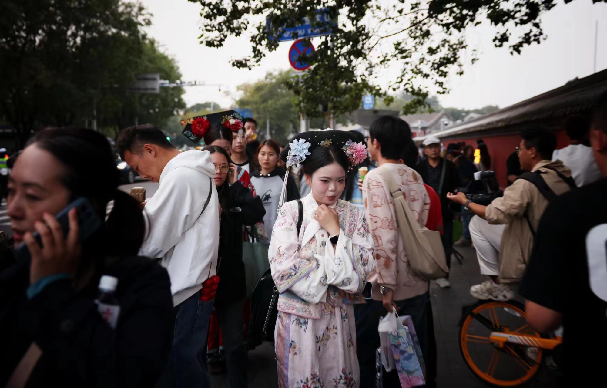 一名身穿格格服的游客穿梭在拥挤的人群中。