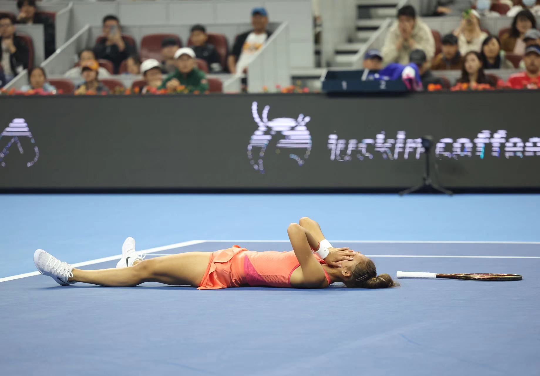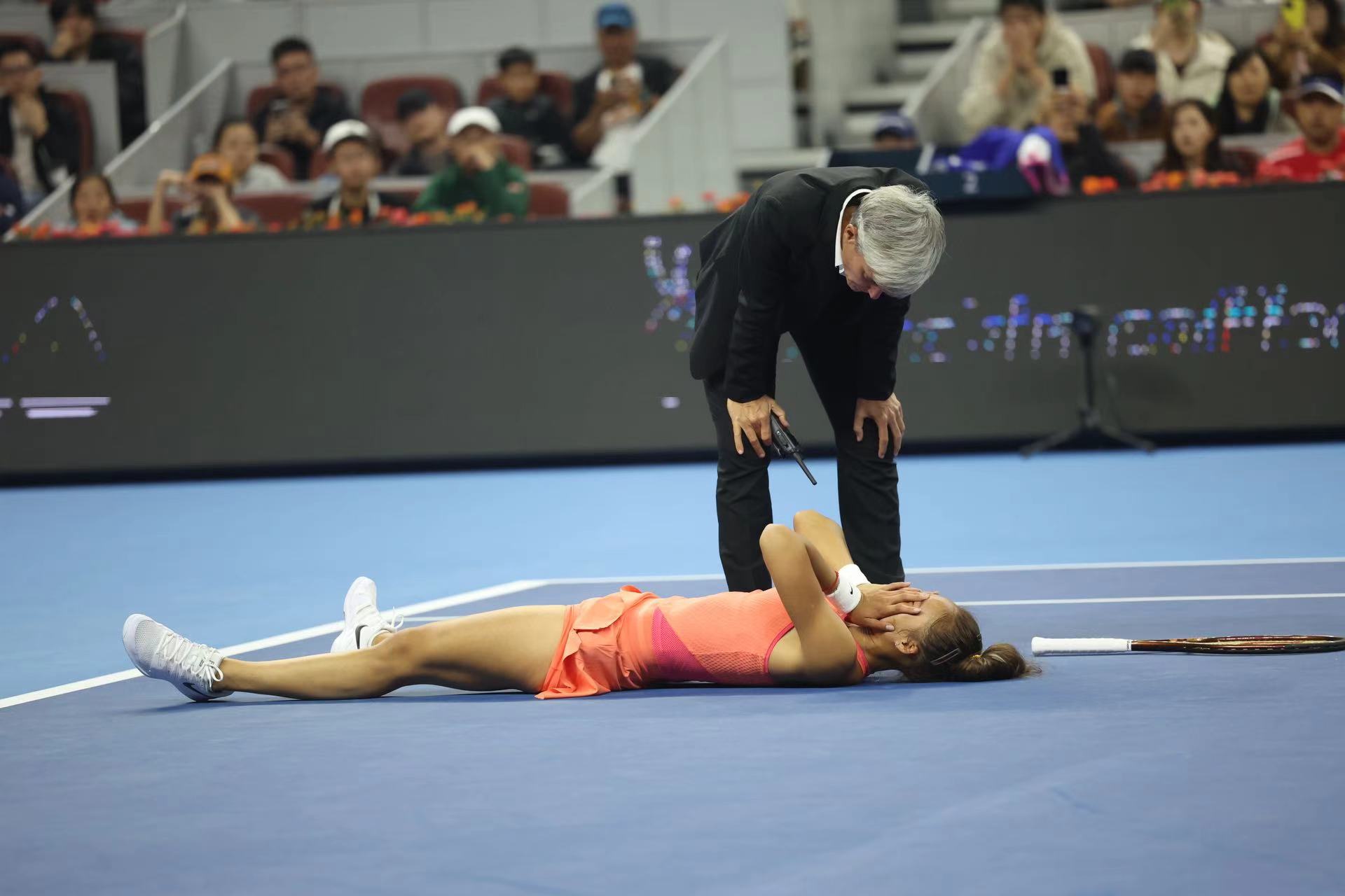 郑钦文摔倒后躺在赛场上。