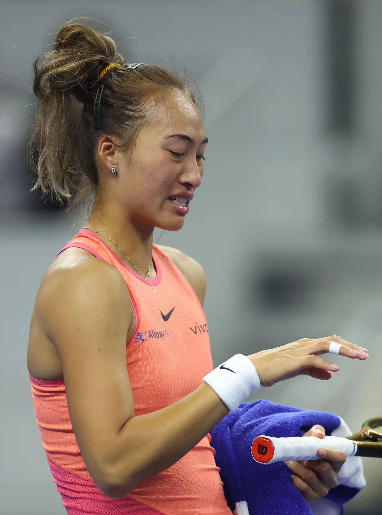 郑钦文救球手指被蹭破。
