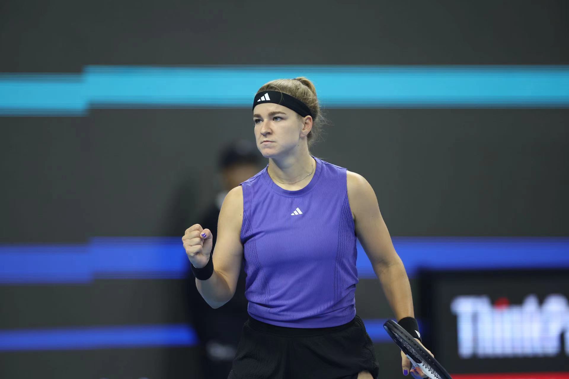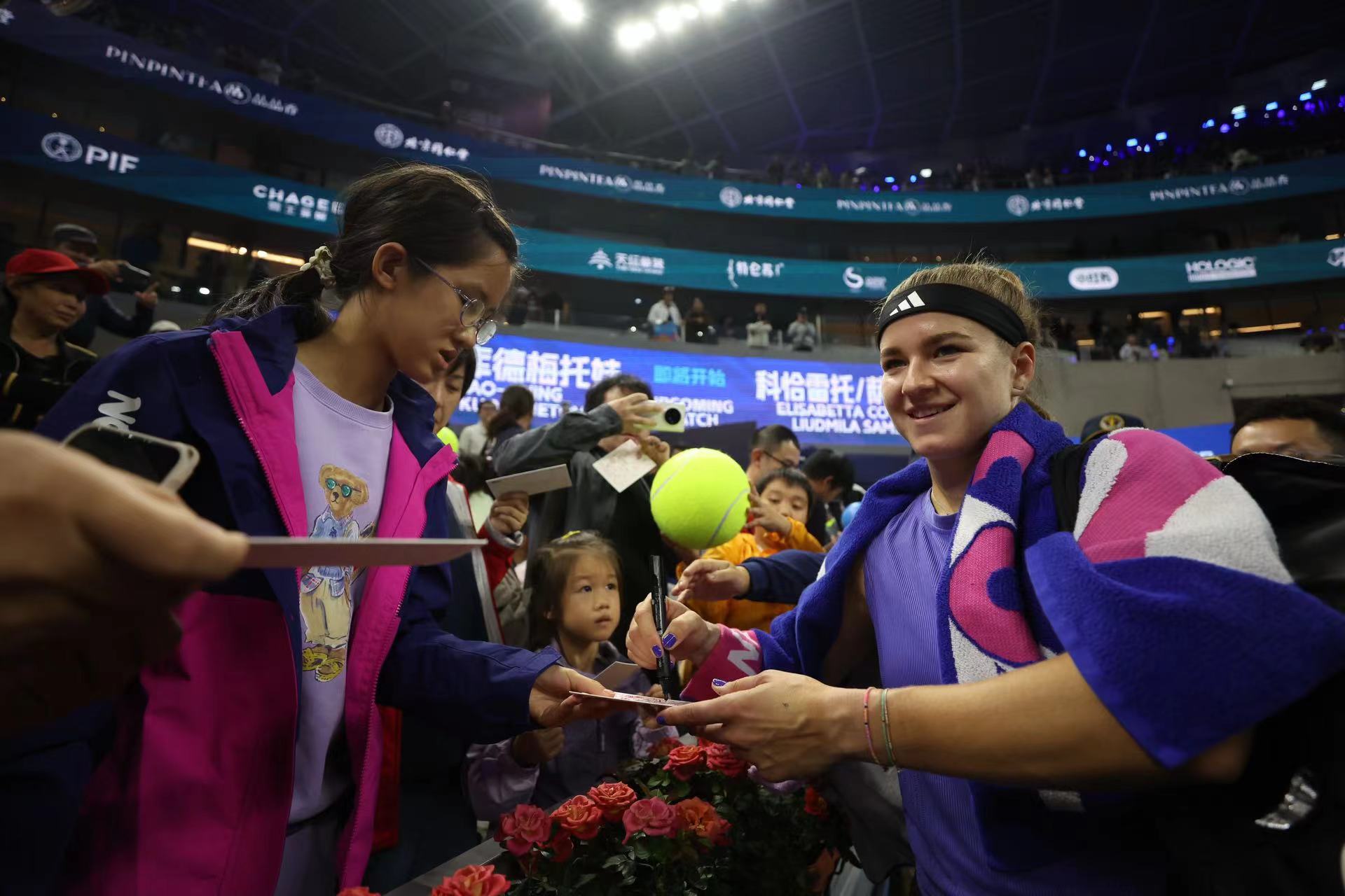 获胜后的穆霍娃为球迷签名。