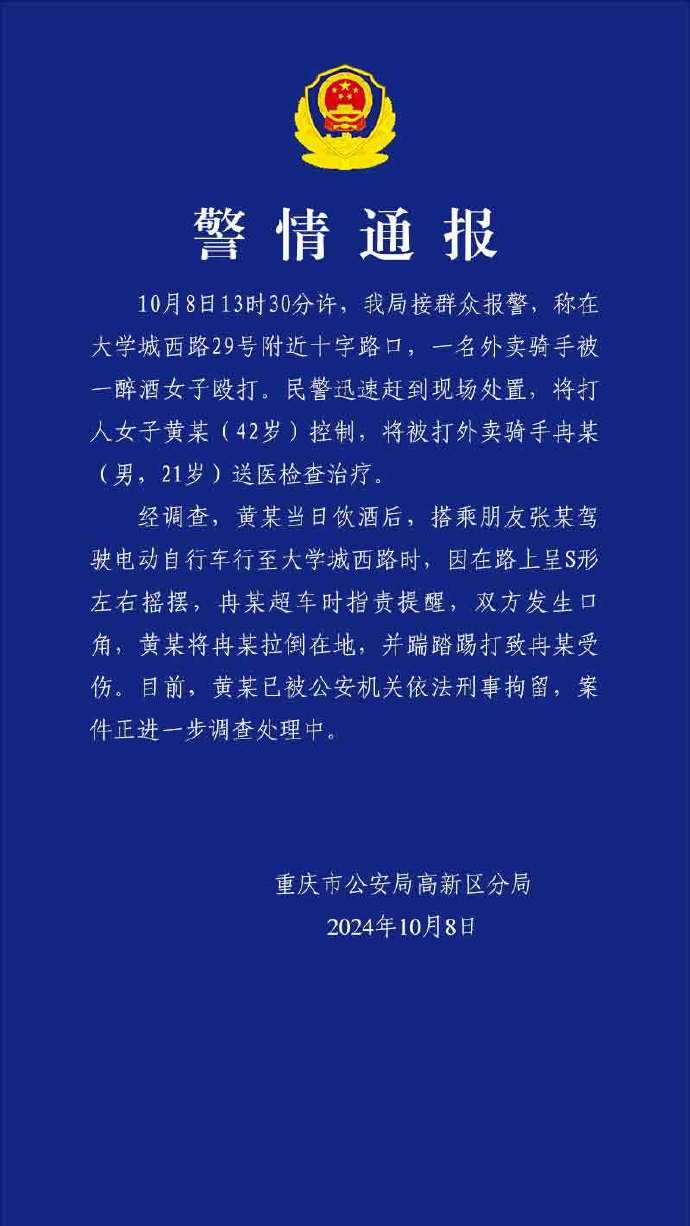 新京报讯 据@平安重庆高新微博消息,10月8日13时30分许,该局接群众报警,称在大学城西路29号附近十字路口,一名外卖骑手被一醉酒女子殴打。民警迅速赶到现场处置,将打人女子黄某(42岁)控制,将被打外卖骑手冉某(男,21岁)送医检查治疗。