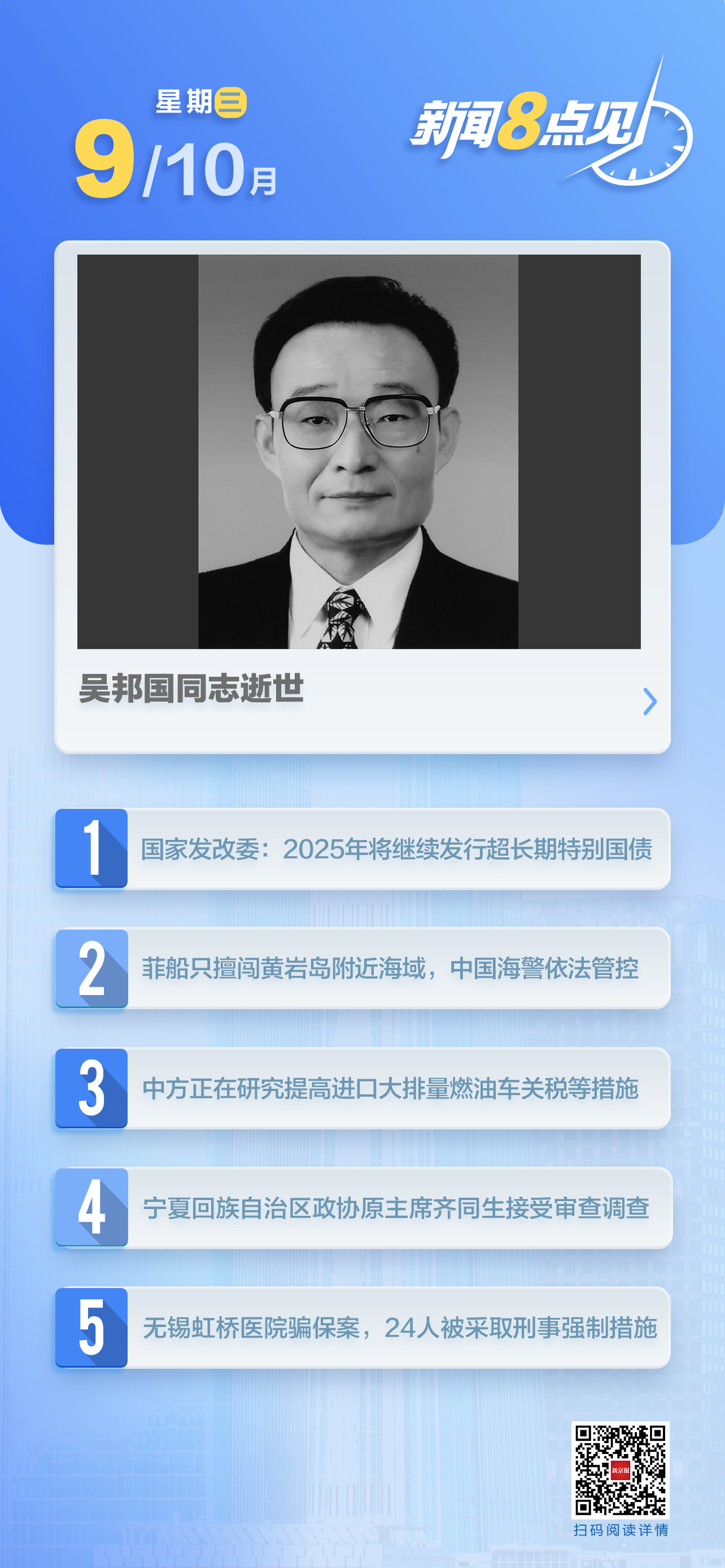 中国共产党中央委员会、中华人民共和国全国人民代表大会常务委员会、中华人民共和国国务院、中国人民政治协商会议全国委员会沉痛宣告:中国共产党的优秀党员,久经考验的忠诚的共产主义战士,杰出的无产阶级革命家、政治家,党和国家的卓越领导人,中国共产党第十四届中央政治局委员、中央书记处书记,第十五届中央政治局委员,第十六届、十七届中央政治局常委,国务院原副总理,第十届、十一届全国人民代表大会常务委员会委员长吴邦国同志,因病医治无效,于2024年10月8日4时36分在北京逝世,享年84岁。(新华社)阅读全文>>>