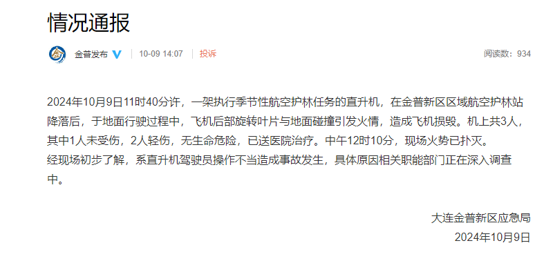 2024年10月9日11时40分许,一架执行季节性航空护林任务的直升机,在金普新区区域航空护林站降落后,于地面行驶过程中,飞机后部旋转叶片与地面碰撞引发火情,造成飞机损毁。机上共3人,其中1人未受伤,2人轻伤,无生命危险,已送医院治疗。中午12时10分,现场火势已扑灭。
