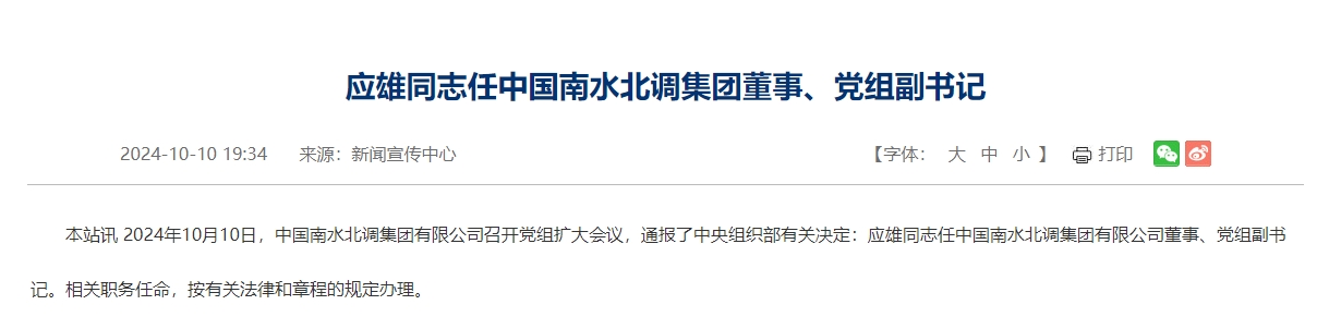 新京报讯 据中国南水北调集团有限公司网站消息,2024年10月10日,中国南水北调集团有限公司召开党组扩大会议,通报了中央组织部有关决定:应雄同志任中国南水北调集团有限公司董事、党组副书记。相关职务任命,按有关法律和章程的规定办理。